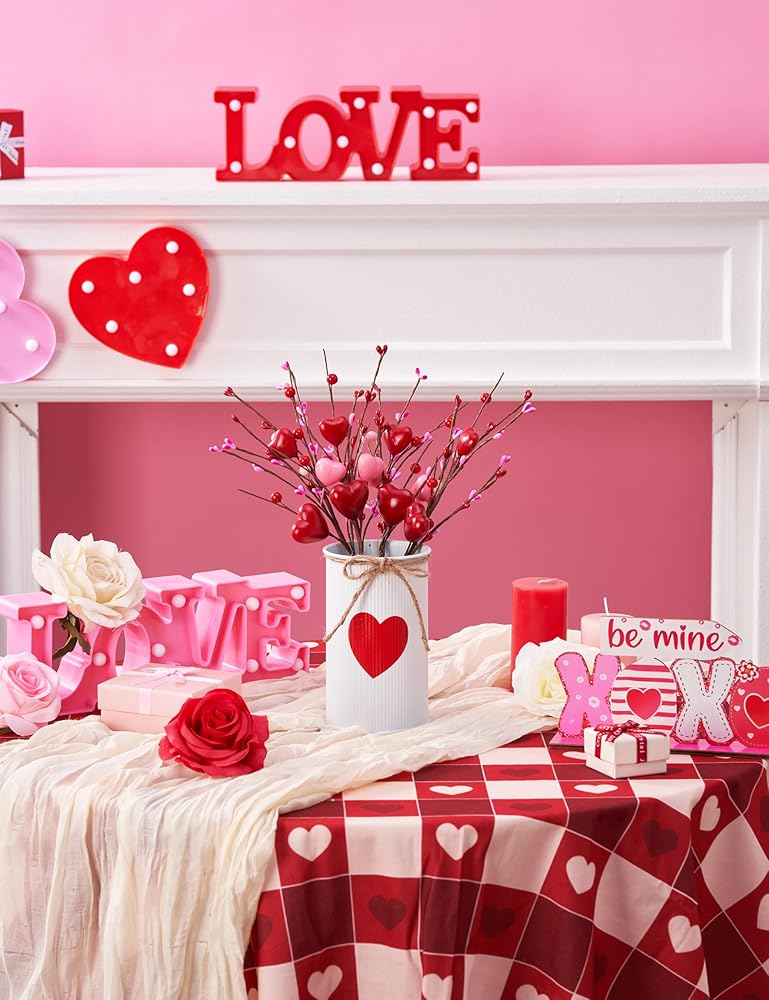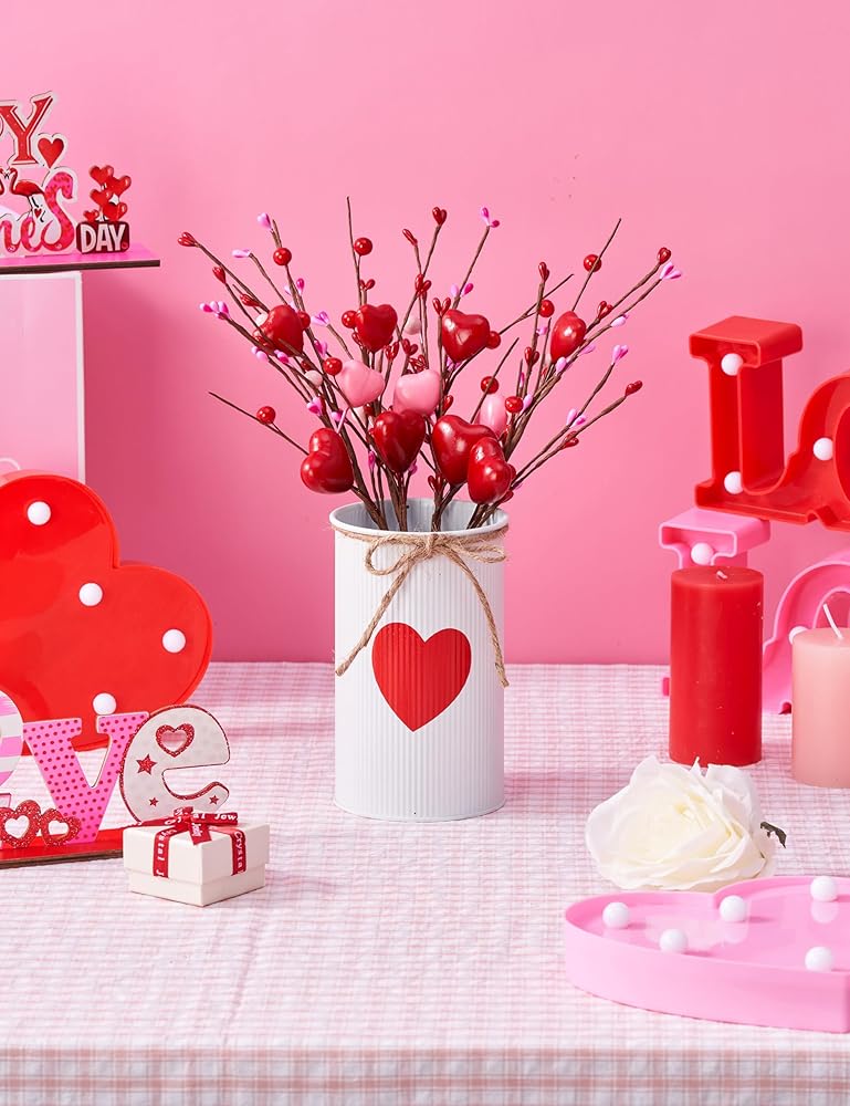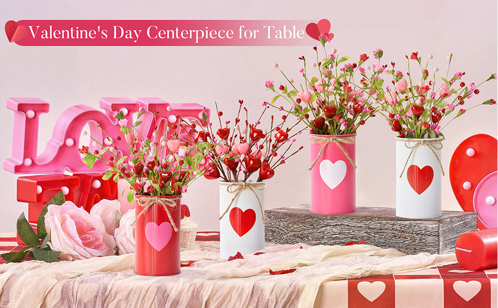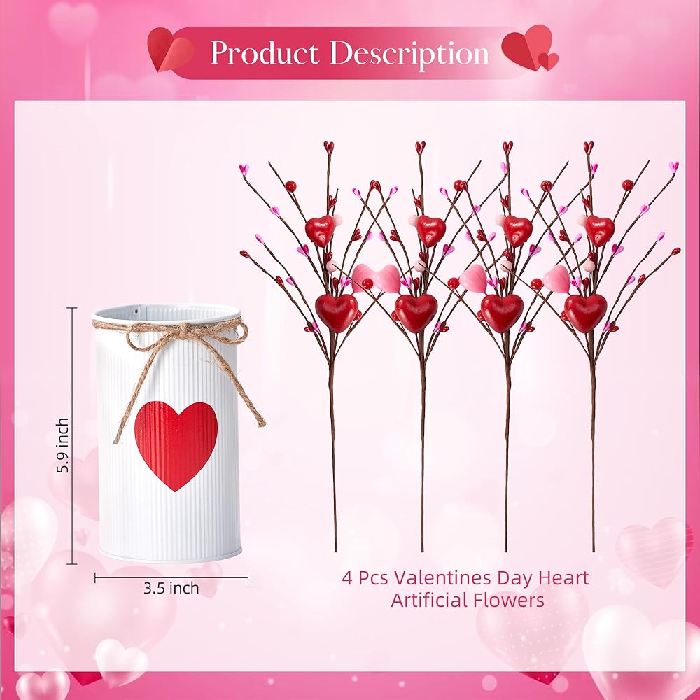 قطع مركزية لعيد الحب للطاولات، ديكور طاولة عيد الحب مع مزهرية معدنية بيضاء مطبوعة على شكل قلب، 4 قطع من الزهور الاصطناعية على شكل قلب، ديكورات طاولة عيد الحب في الأماكن المغلقة للمنزل والمطبخ