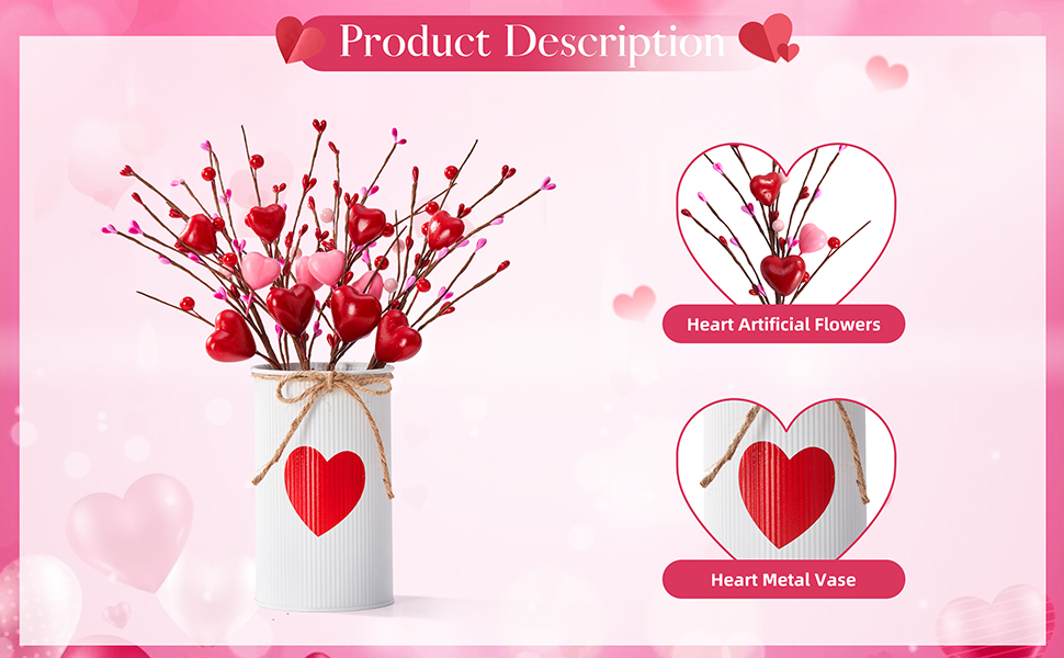 تصميم فريد: تتضمن مجموعة ديكورات طاولة عيد الحب الخاصة بنا مزهرية معدنية بيضاء مطبوعة على شكل قلب، و4 قطع من الزهور الاصطناعية على شكل قلب. تجتمع هذه الملحقات لتشكل ديكورًا مثاليًا لطاولة عيد الحب، مما يضمن أن تكون ديكورات عيد الحب الخاصة بك فريدة من نوعها. زينة عيد الحب لدينا ليست مجرد زينة ولكنها تستخدم أيضًا بمفردها.