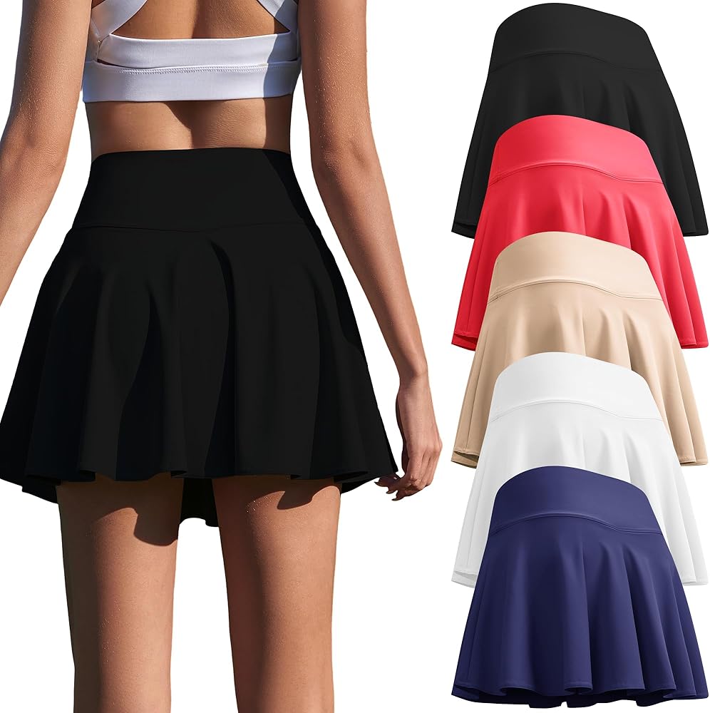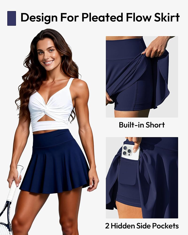 High Waisted A-Line Fit: Athletic skorts for women are designed with a high-rise waistband that provides gentle tummy support and a secure fit. The flattering A-line silhouette and flowy pleated hem enhance your natural shape while allowing easy movement