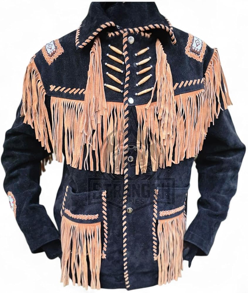 Step into the wild west with our Men's Suede Leather Western Cowboy Jacket, designed with authentic Native American influences. This eye-catching jacket blends rugged cowboy style with intricate, cultural artistry, making it the perfect addition to your wardrobe. Crafted from premium suede leather, this jacket features fringe detailing along the shoulders, chest, and sleeves, creating a dynamic, flowing look that embodies the spirit of the cowboy. The light tan fringe contrasts beautifully with the deep black suede, making this jacket a bold statement piece. The jacket is adorned with beaded accents and embroidered stitching, carefully placed to add a unique, cultural touch. The front features a row of bone-like buttons that further enhance its western charm, while the chest and shoulder areas showcase intricate bead designs that reflect the timeless artistry of Native American culture. Not only is this jacket a standout fashion piece, but it also offers practical comfort. The well-constructed design includes functional pockets and a stylish fit, perfect for any occasion — whether you're heading to a festival, out for a casual day, or looking for something distinctive to wear. Embrace the freedom and rugged beauty of western fashion with this beaded, fringed suede jacket, a versatile and timeless piece that celebrates both cowboy and Native American heritage.