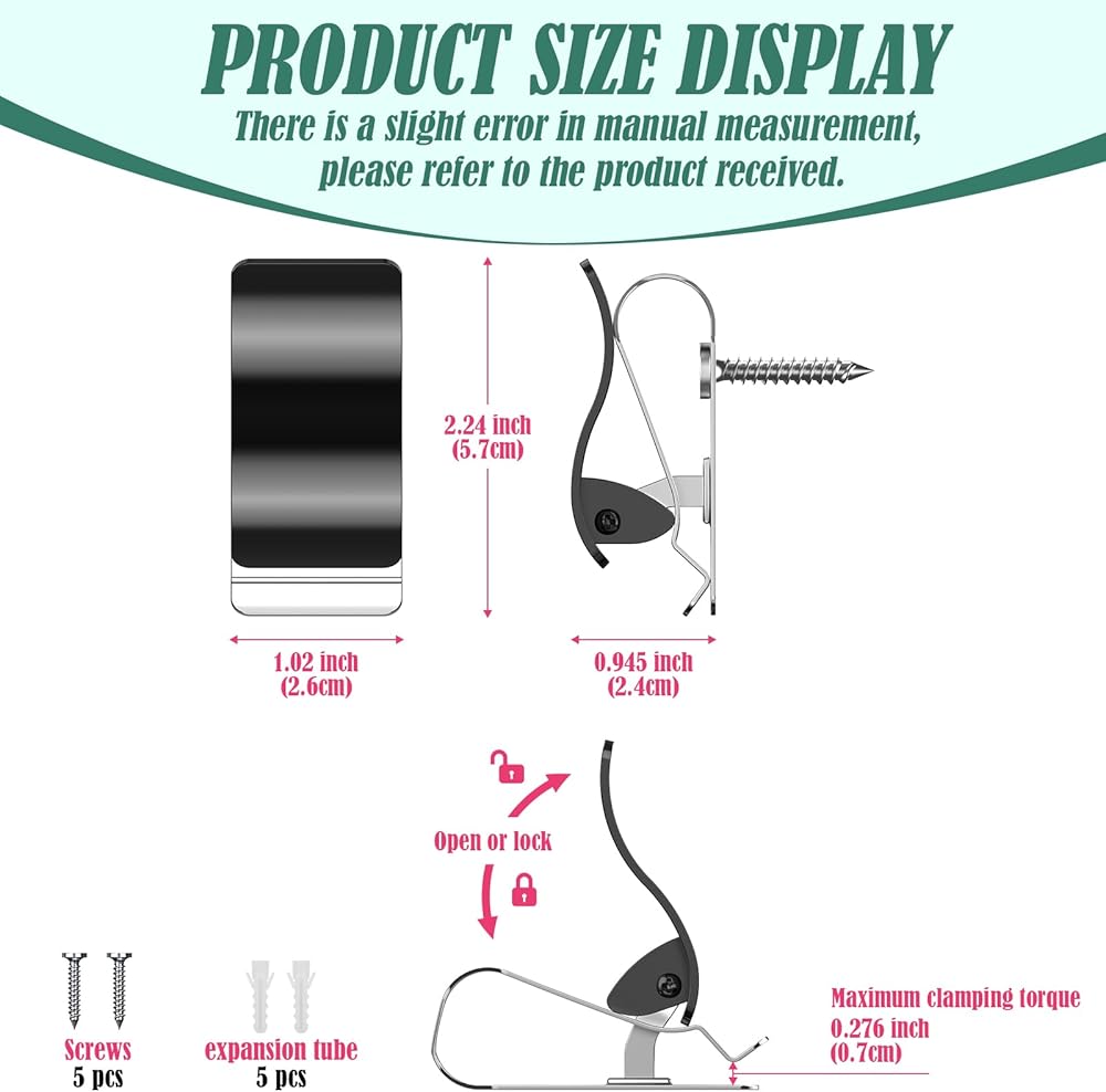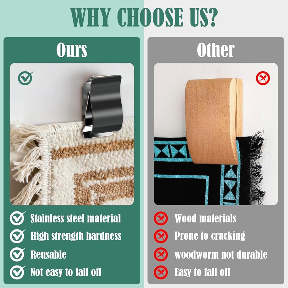 المادة - مشابك الحائط مصنوعة من الفولاذ المقاوم للصدأ عالي الجودة، قوي جدًا ومتين من الشماعات البلاستيكية. مصمم لمقاومة الخدوش اليومية والتآكل وفقدان البريق. السماح لها بالبقاء في أفضل حالاتها لفترة أطول.