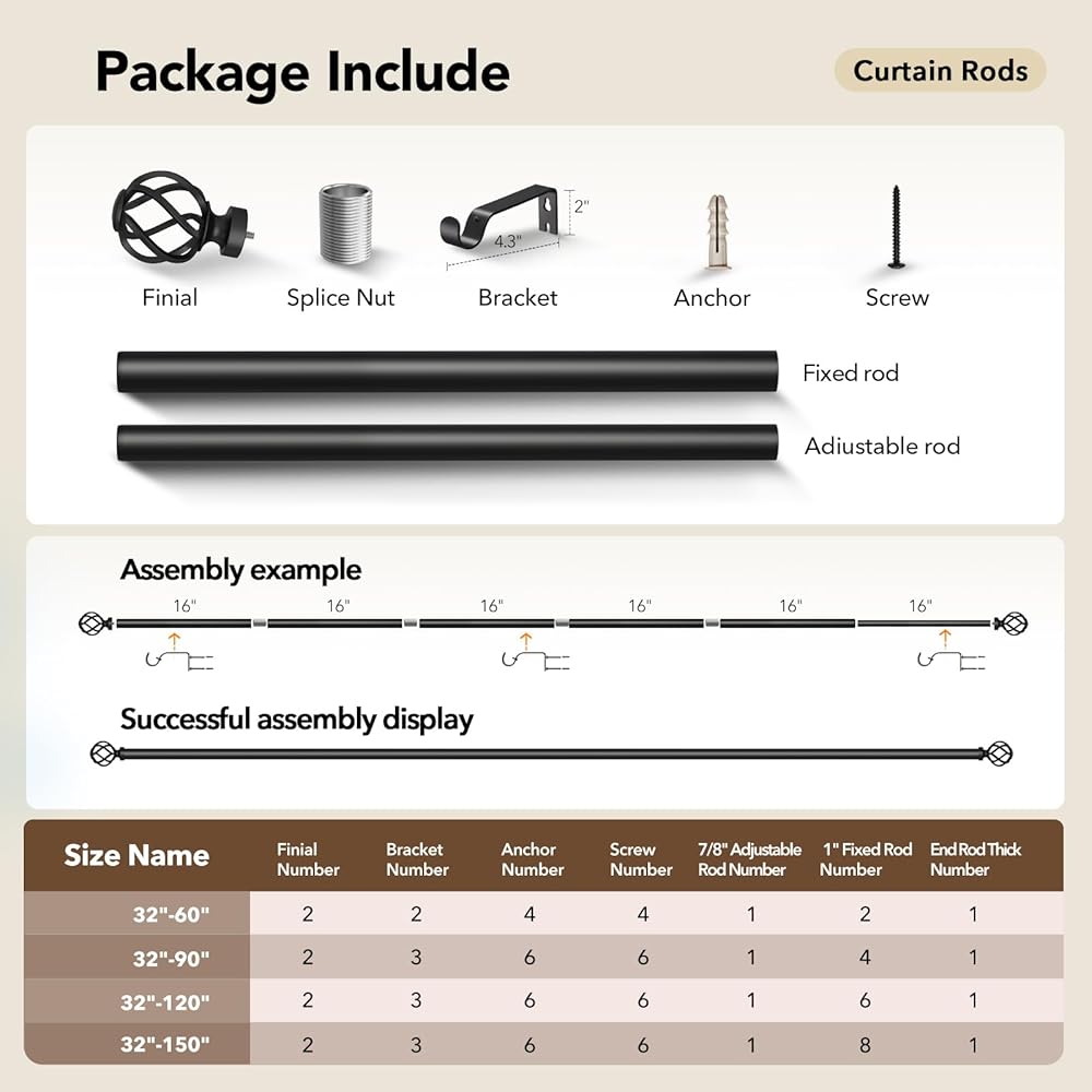 • قضيب ستارة قابل للتعديل غير قابل للانحناء - مصمم ليناسب مجموعة واسعة من أحجام النوافذ (بما في ذلك نطاق الطول القابل للتوسيع)، يأتي قضيب الستارة القابل للتعديل مع تركيبة من 8 قضبان تحتاج إلى ربطها معًا، ويمكن تعديل الطول إلى 81.28 سم - 120 سم ليناسب نافذتك. وفي الوقت نفسه، يتم توصيل كل قضيب ستارة بصواميل توصيل داخلية، مما يجعل قضيب الستارة الخاص بك أكثر استقامة وأقل عرضة للتمزق.