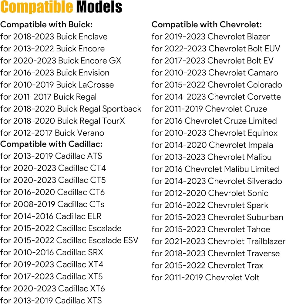 • 【Compatible with the following vehicles】Compatible with Chevrolet Silverado 2013-2018, for Equinox 2010-2018, for Cruze 2011-2018, for Malibu 2013-2018, for Impala 2014-2018, for Traverse 2018, for Colorado 2015-2018, for Camaro 2010-2018, for Trax 2015-2018, for Sonic 2012-2018, for Corvette 2014-2018, for Volt 2011-2018, for Spark 2016-2018, for Bolt 2017-2018, for Aveo 2012-2018