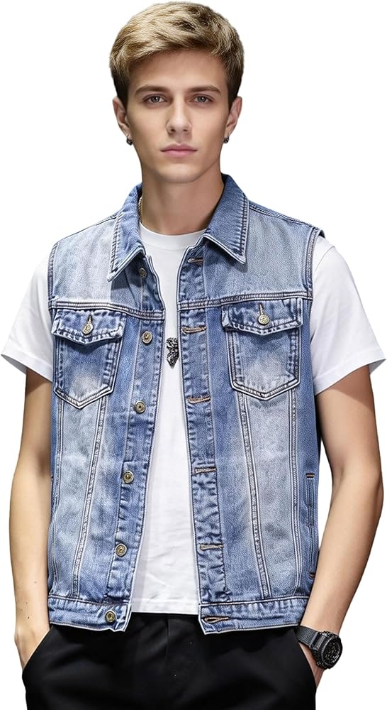 تصميم كلاسيكي من الدنيم ¨C طراز سائق الشاحنة بدون أكمام مع مظهر متين مستوحى من راكبي الدراجات النارية لمظهر كاجوال وجذاب.