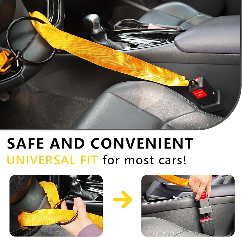 • 【نظام أمان مزدوج: مقاوم للحفر والالتقاط】مجهز بقلب قفل حاصل على براءة اختراع وواقي حفر فولاذي مقوى، يقاوم قفل السيارة الخاص بنا الاختراقات الفنية لأكثر من 15 دقيقة ويتحمل ما يصل إلى 5 دقائق من هجمات الحفر. يضمن الغلاف الواقي المرن الموجود حول سلسلة قفل حزام الأمان عدم حدوث أي ضرر لعجلة القيادة، حتى أثناء الدورات العنيفة.