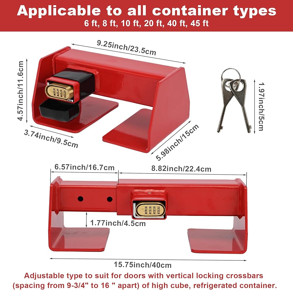 • 【نطاق التوافق】تم تصميم قفل باب الشاحنة لقضبان أبواب البضائع العمودية ذات عرض الفجوة بين 9¾ بوصة و16 بوصة. وهو متوافق مع جميع أقفال الحاويات القياسية - بما في ذلك تلك المستخدمة في حاويات 10 قدم و20 قدم و40 قدم و53 قدم ومقر رئيسي وحاويات كونيكس - مما يوفر حلاً موثوقًا وآمنًا لمنع السرقة وحماية البضائع.