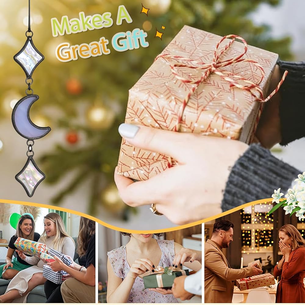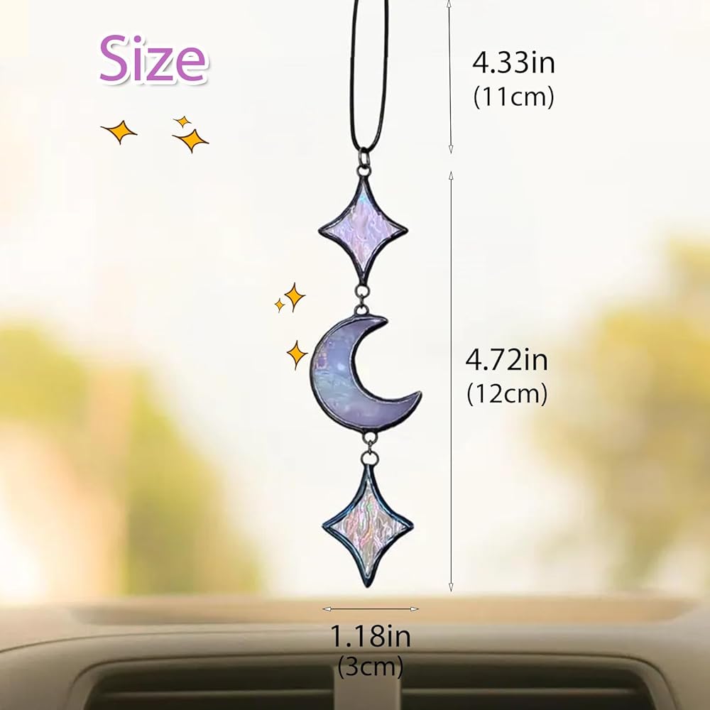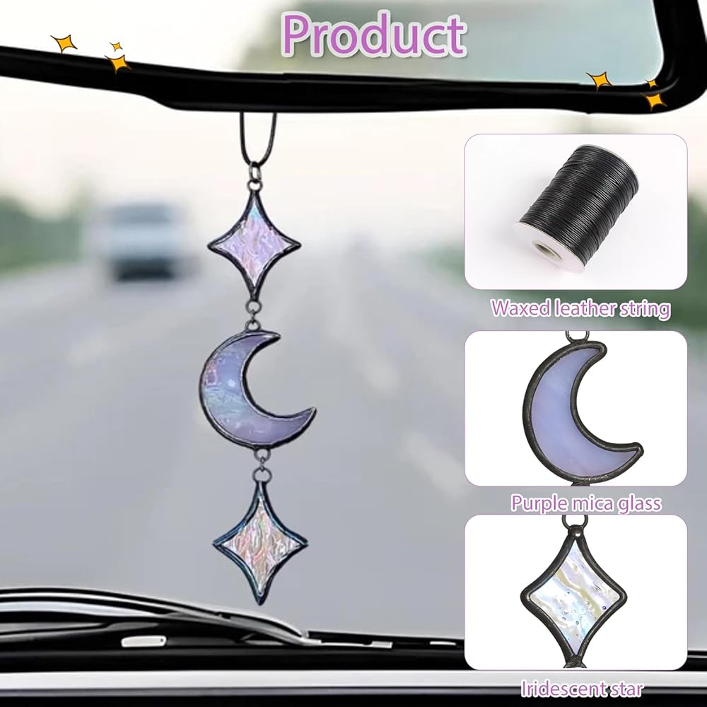 💜【Handcraftsmanship】This Moon & Star Car Charm is crafted with real colored glass and copper foil (not cheap acrylic/plastic), featuring iridescent star glass that refracts soft rainbow sparkles when exposed to light. The matte black frame boasts a premium texture, being sturdy and wear-resistant—each piece is a one-of-a-kind handcrafted item, adding an exclusive touch to your car.