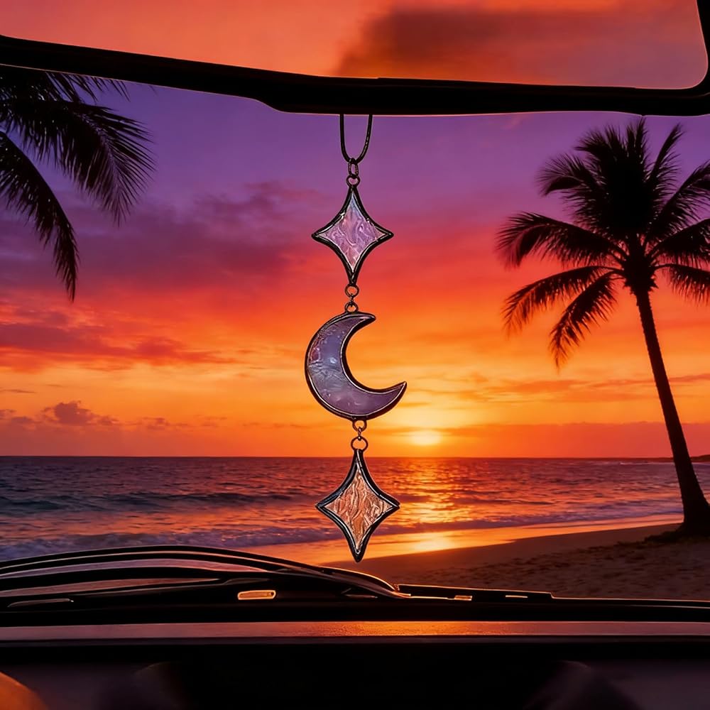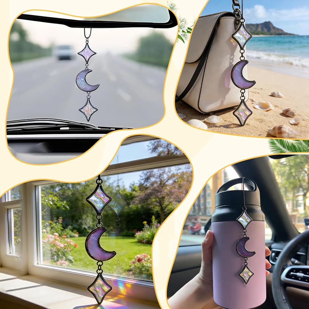 💖【Mystical Bohemian Aesthetic Decoration】Designed with a purple crescent moon and iridescent stars, it perfectly fits mystical witchy vibes, astrological themes, or bohemian tastes. Hung on the car rearview mirror, it sways gently with the breeze during drives, infusing the cabin with a dreamy and serene atmosphere—both decorative and ambiance-enhancing.
