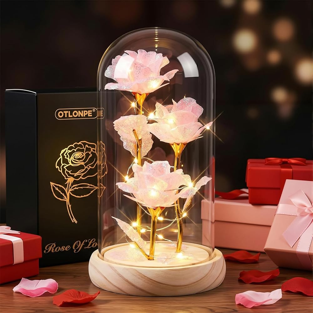 The Otlonpe Forever Preserved Glass Rose is a timeless gift that captures the beauty of 3 roses flowers in an elegant glass dome. Standing 7.8 inches tall, this enchanting piece features a preserved glass flower that will never wilt or fade, symbolizing everlasting love and appreciation. The built-in LED light illuminates the rose from within, creating a romantic and magical ambiance perfect for any room. This stunning keepsake makes an ideal gift for the special women in your life, whether it's for your mom, grandma, girlfriend, wife, or sister. Perfect for celebrating birthdays, Valentine's Day, Mother's Day, Christmas, or any occasion when you want to express your heartfelt sentiments. The foerver glass rose combines natural beauty with modern design, creating a memorable present that will be treasured for years to come. The glass enclosure protects the delicate flower while showcasing its intricate details, making it both a decorative accent and a meaningful token of affection.