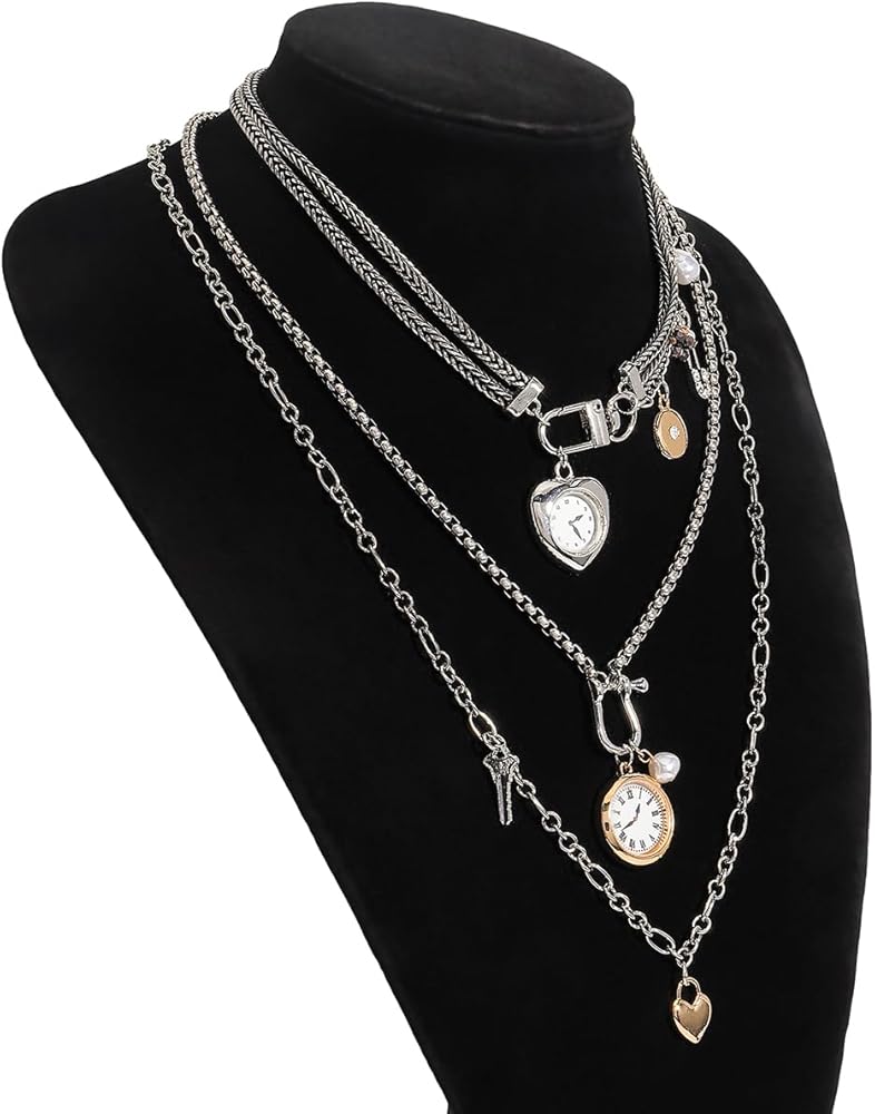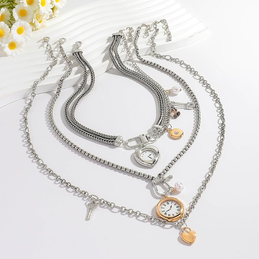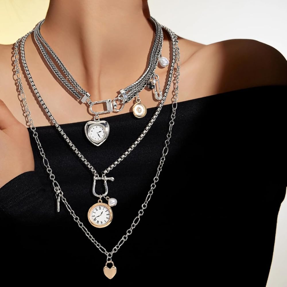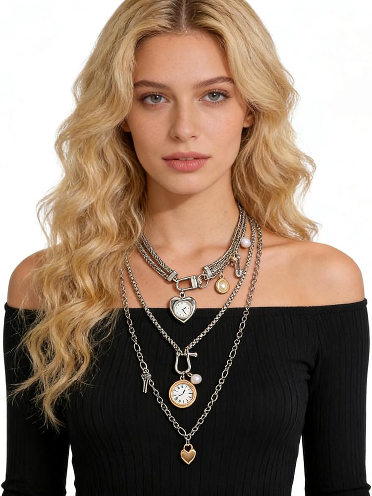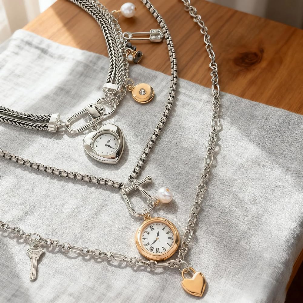 تفاصيل قلادة الساعة والقلب: تتميز المجموعة بسلاسل ذات نسيج مختلط (معدن مضفر + مصقول) مقترنة بلمسات غريبة الأطوار: ساعة صغيرة على شكل قلب، وساعة دائرية ذات طراز عتيق، وحلية قلب ذهبية، ولؤلؤ، ودبوس أمان. تعزز العناصر ذات اللونين (الفضي + الذهبي) مظهرها العصري والمتعدد الاستخدامات.