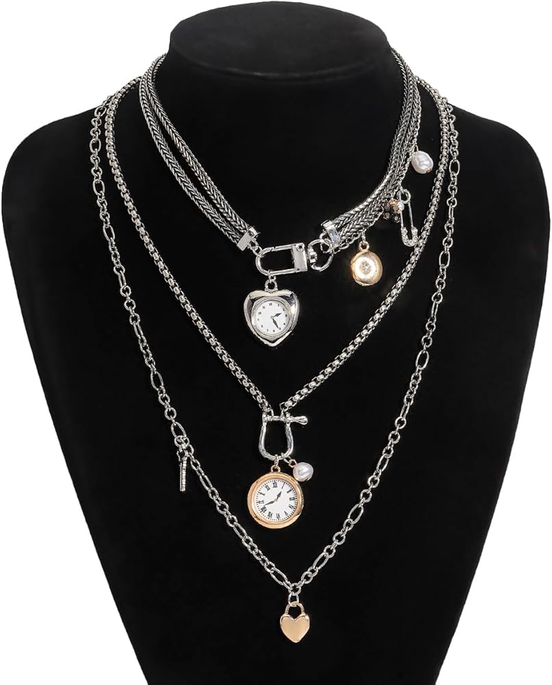 قلادات فضية الطبقات للنساء: تصميم أنيق على الملابس ذات الطبقات - مجموعة القلادات المكونة من 3 جدائل تمزج بين التصميمات المضفرة ومشبك الورق وسلسلة الوصلات، المليئة بالمعلقات المرحة (ساعات صغيرة، قلب، لؤلؤ، دبوس أمان) لإضافة حافة وسحر إلى أي ملابس، تناسب المظهر غير الرسمي أو الحفلات أو اليومي.