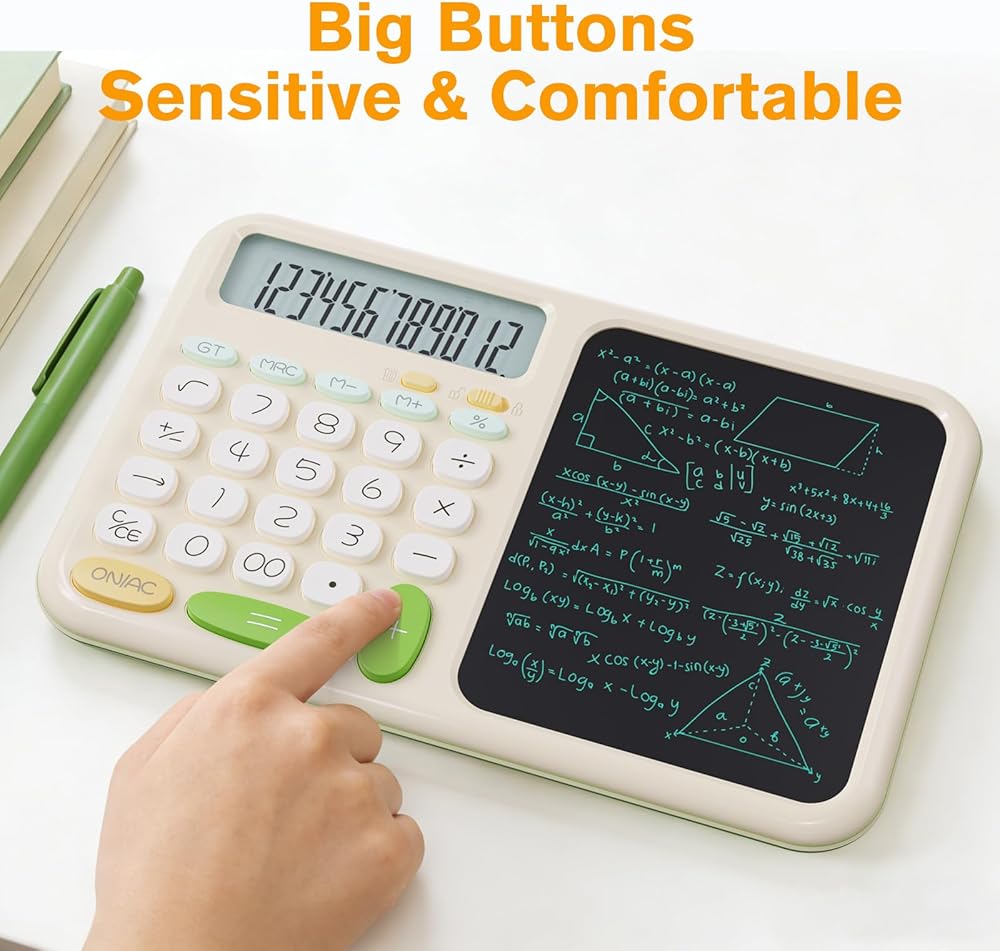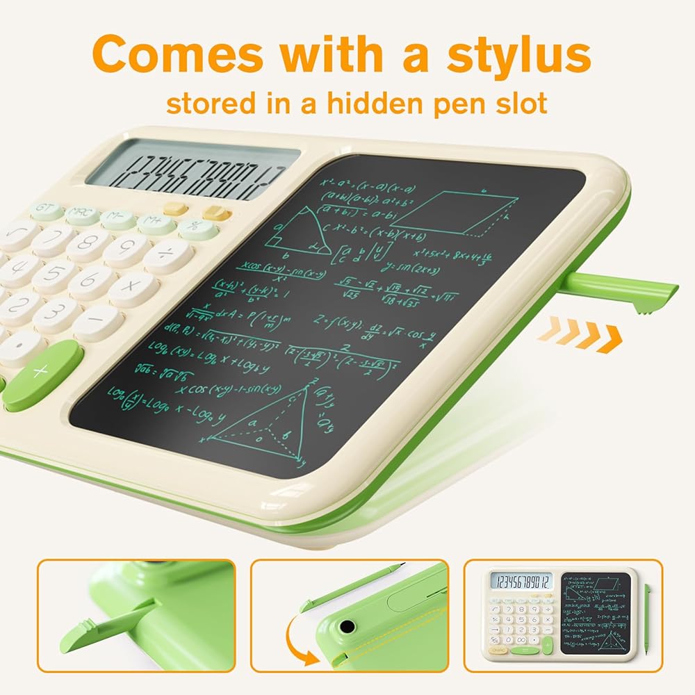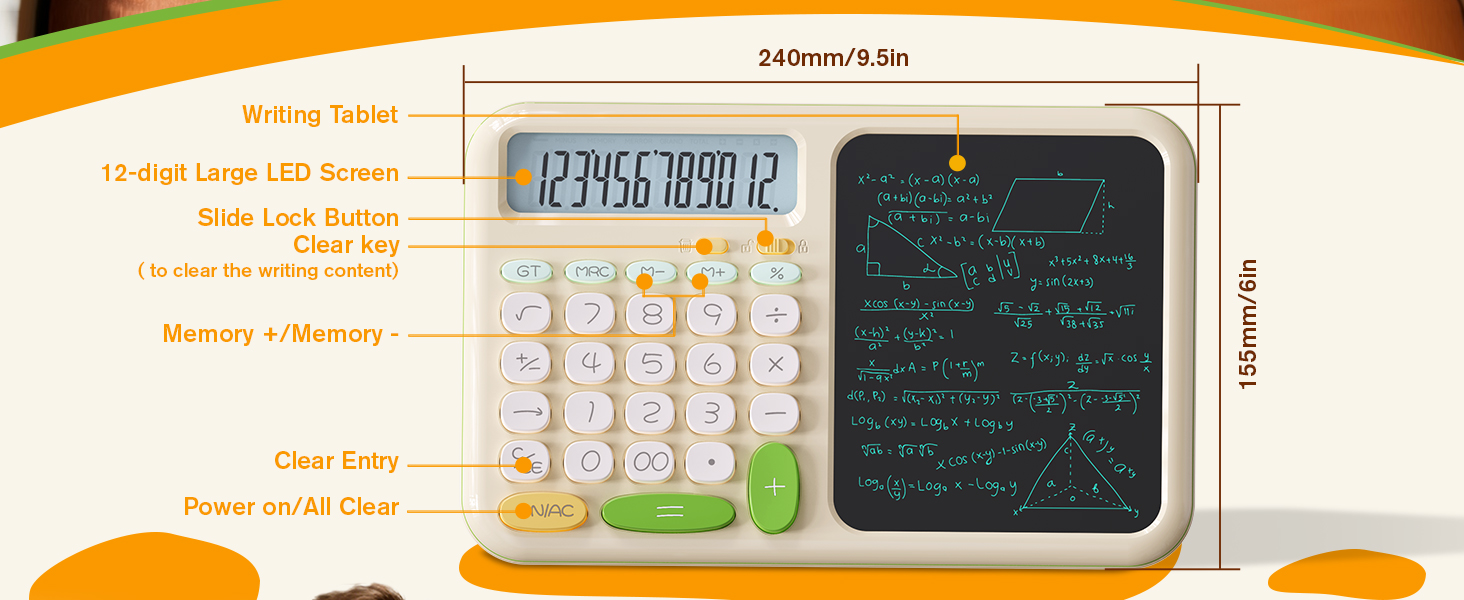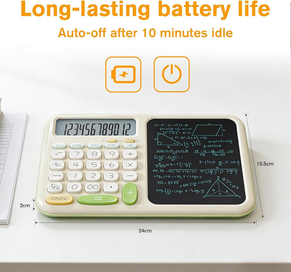 إيقاف التشغيل التلقائي لمدة 8 دقائق لتحقيق الكفاءة: يشتمل الجهاز على ميزة إيقاف التشغيل التلقائي لمدة 8 دقائق والتي تحافظ على الطاقة أثناء عدم النشاط. تساعد هذه الوظيفة الذكية على إطالة عمر البطارية، مما يضمن بقاء الآلة الحاسبة ولوحة الكتابة موثوقين طوال جلسات الدراسة أو العمل الطويلة
