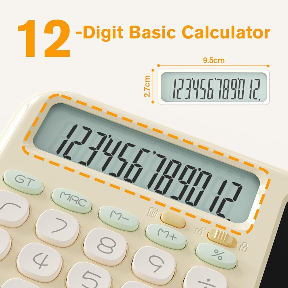 شاشة HD مكونة من 12 رقمًا ومفاتيح PVC: توفر شاشة HD المكونة من 12 رقمًا أرقامًا حادة وسهلة القراءة لإجراء حسابات دقيقة. توفر المفاتيح الصلبة المصنوعة من مادة PVC نقرة قوية ومريحة مع متانة ممتازة، مما يمنح الجهاز بأكمله إحساسًا قويًا ومتينًا في الاستخدام اليومي