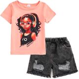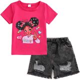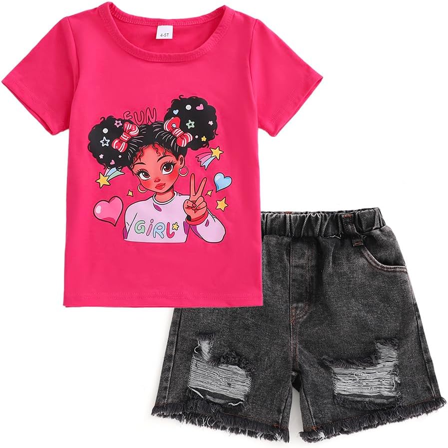 Kids Toddler Girls Summer Clothes Cute Girl Character Print + Black Distressed Denim Shorts 2 Piece Outfits