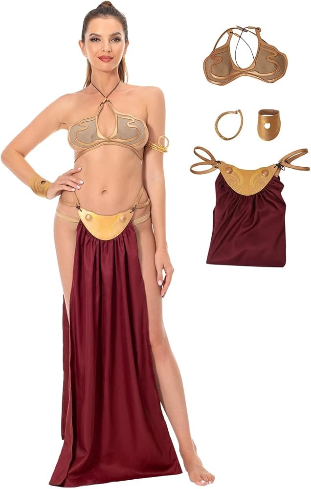 - Type: Princess Slave Gold Bikini Costume Outfit for Adult Women Queen Cosplay Top Skirt.