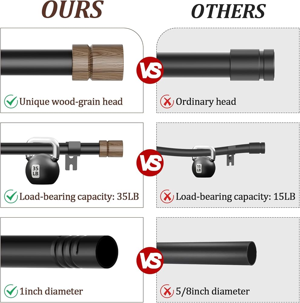 قطر 1 بوصة: يمكن لقضيب الستارة الخشبي حمل ما يصل إلى 35 رطلاً. حجمها القياسي يجعلها متوافقة مع الستائر المتوفرة في السوق