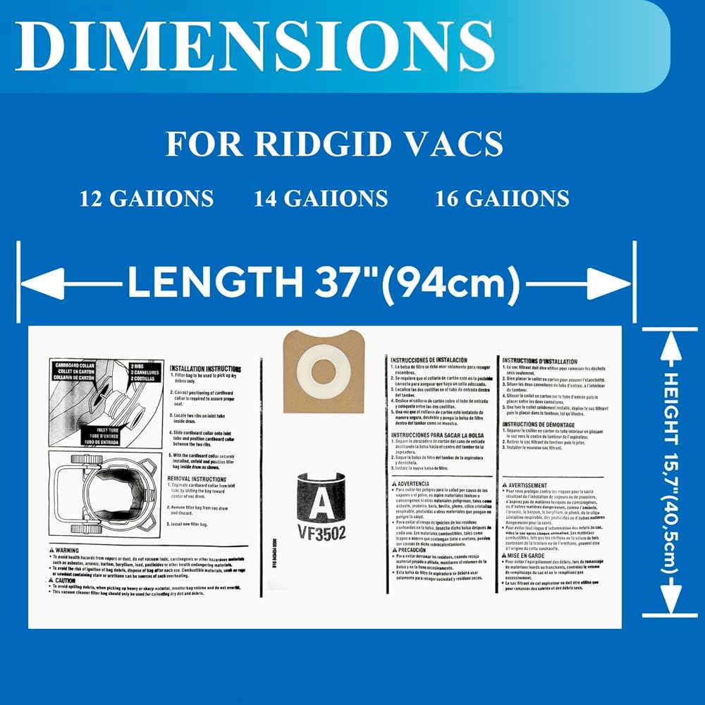 • COMPATIBILITY --- The 23743 VF3502 Shop Vac Bags are compatible with Ridgid 12-16 gallon wet dry vacs: HD1200, HD1280, MOB1200, WD12701, HD1400, RV2400HF, WD1450, HD1600, HD1800, MOB1600, WD1640, WD1680, WD1851, WD1956