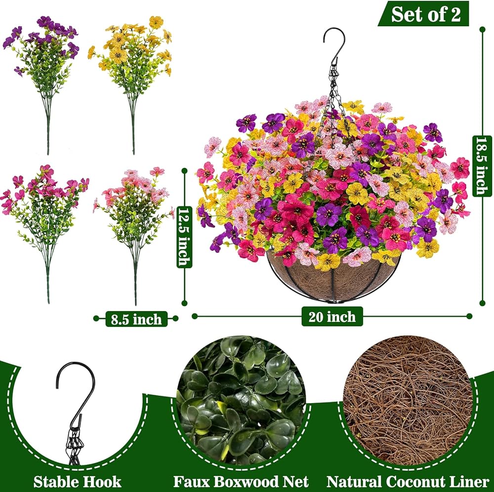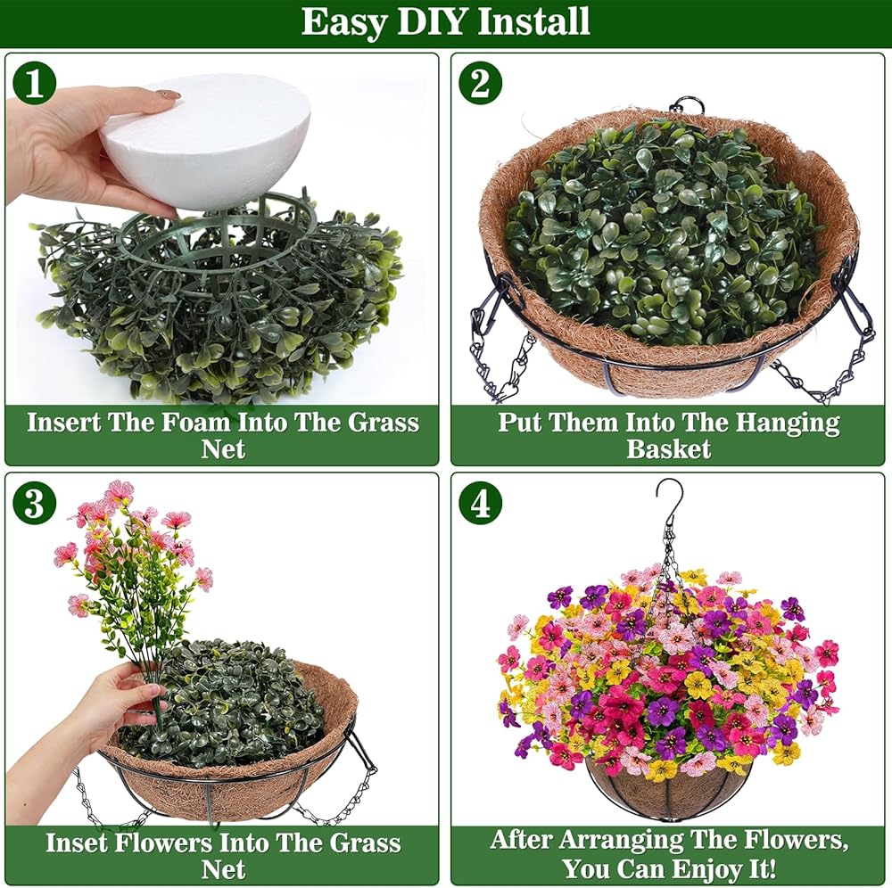【Quick & Easy Assembly】Enjoy simple DIY assembly with no styrofoam needed. In just minutes, you can create two lush fake hanging baskets. For added stability in windy conditions, simply place stones inside the outdoor hanging planter to keep your artificial hanging baskets secure and beautifully displayed.