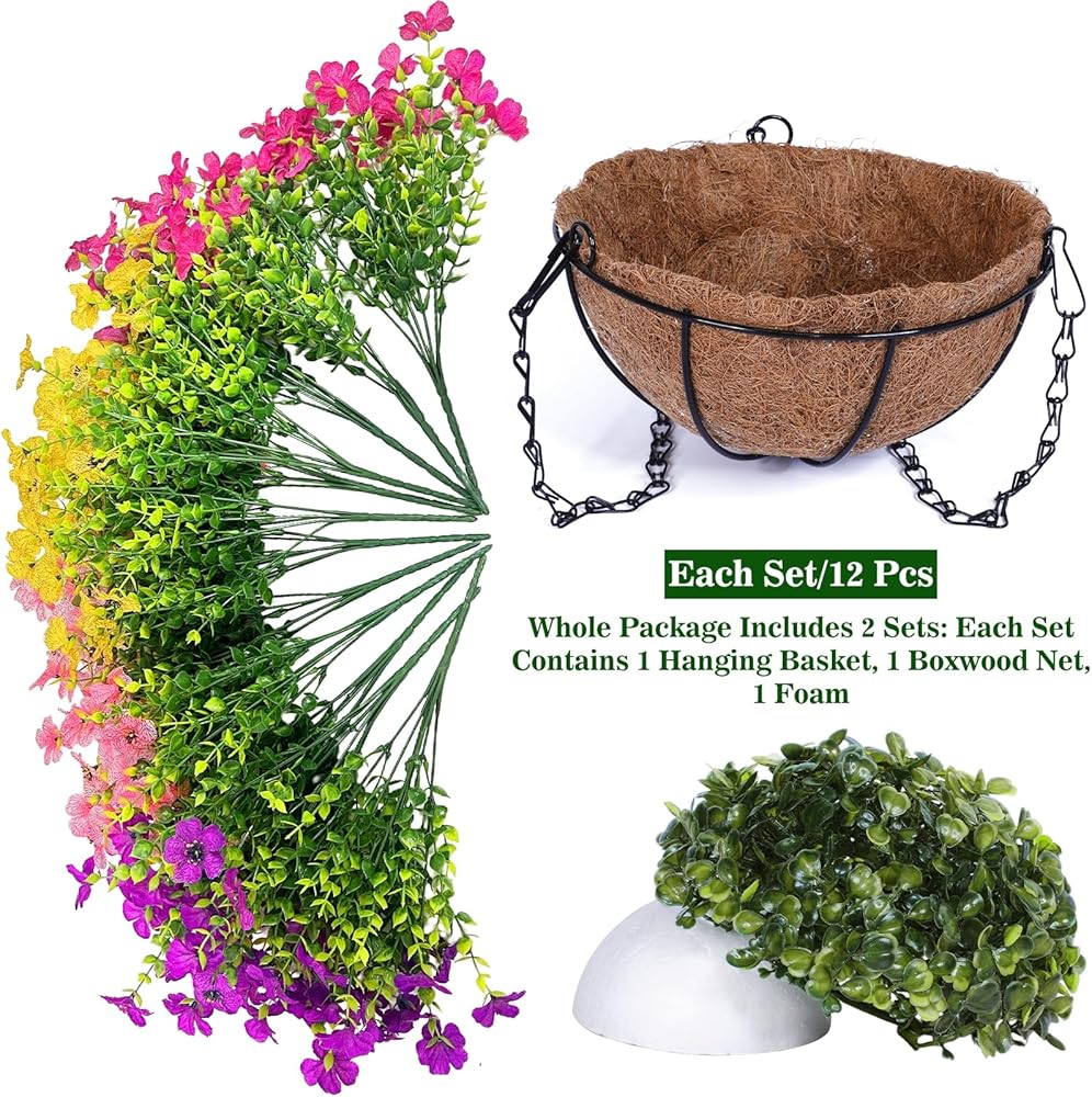 【Complete Hanging Basket Kit】Each package includes two hanging baskets, 24 packs of artificial hanging flowers, and two hemispherical plastic plant balls. Designed with premium materials, our fake hanging plants offer a natural look and long-lasting durability for any setting.
