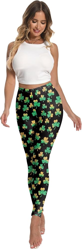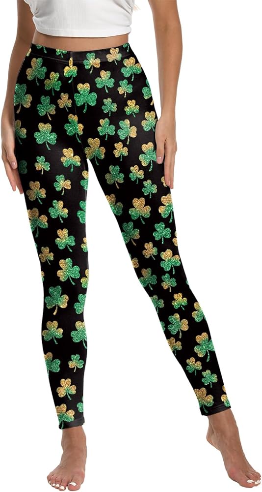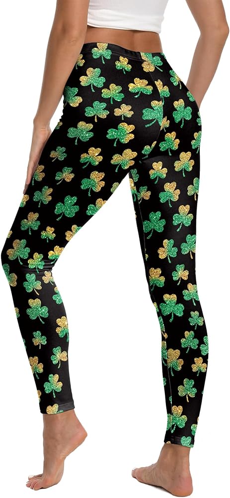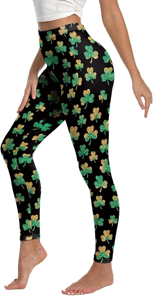 سراويل ضيقة ليوم القديس باتريك للنساء، مقاس كبير، سراويل ضيقة خضراء شامروك عالية الخصر للنساء، سراويل يوجا سفلية للنساء باللون الأسود