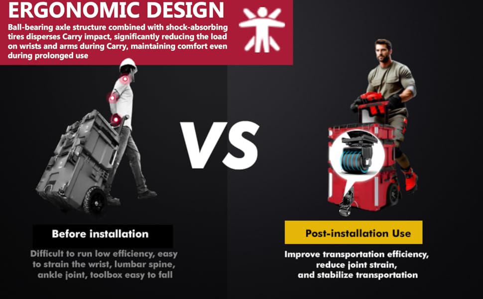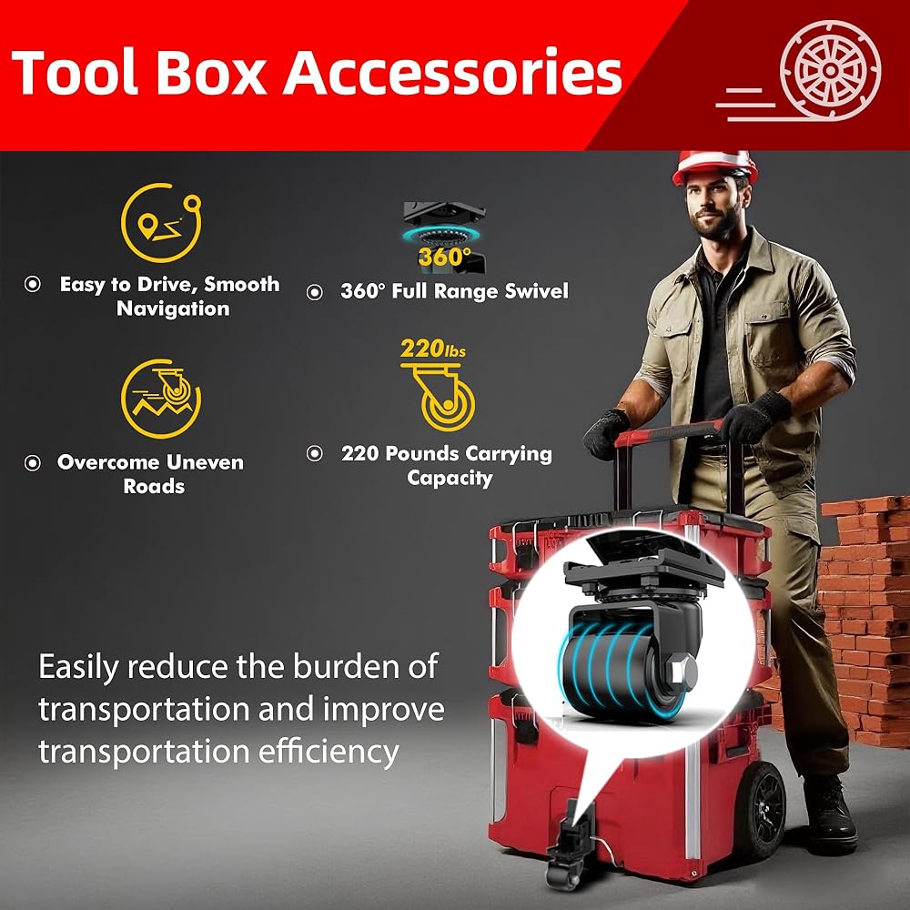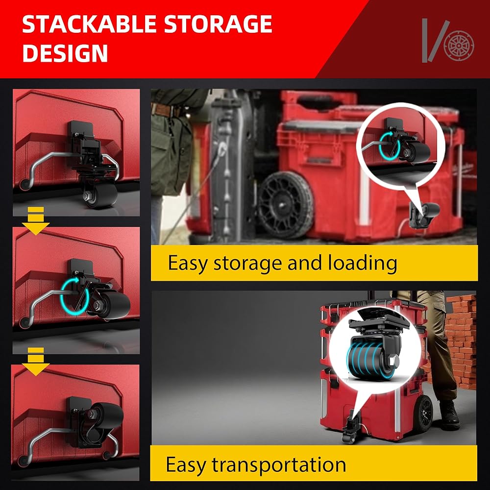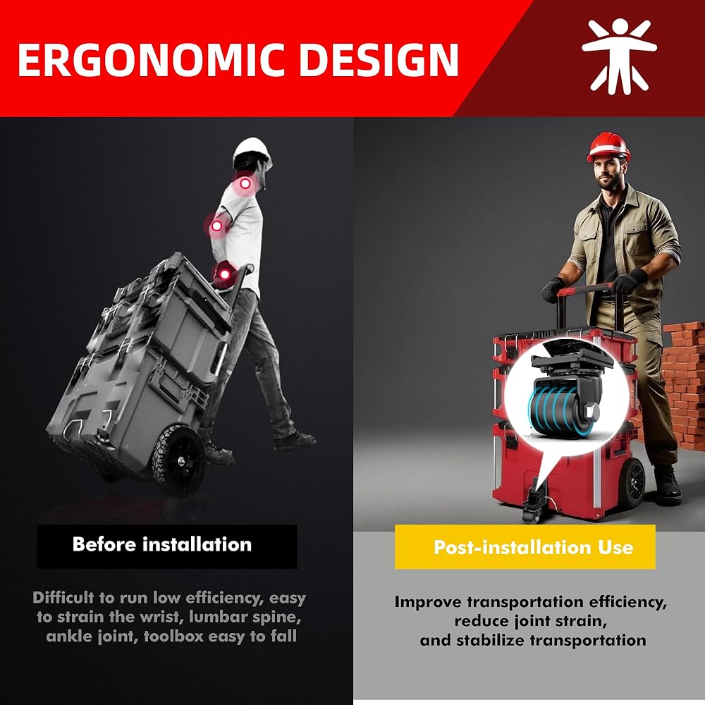 انزلاق وتحكم بدون جهد: قم بترقية نظام التعبئة الخاص بك بعجلات أمامية سهلة الانزلاق. قم بتحريك صناديق أدوات Packout المحملة بالكامل بضغطة خفيفة - دون الحاجة إلى الرفع أو السحب. توفير الطاقة وتقليل الضغط البدني بشكل كبير في موقع العمل