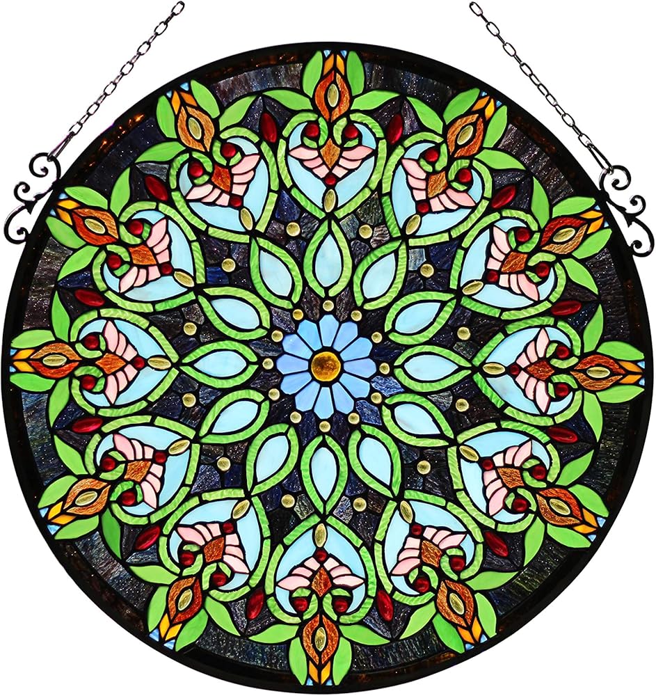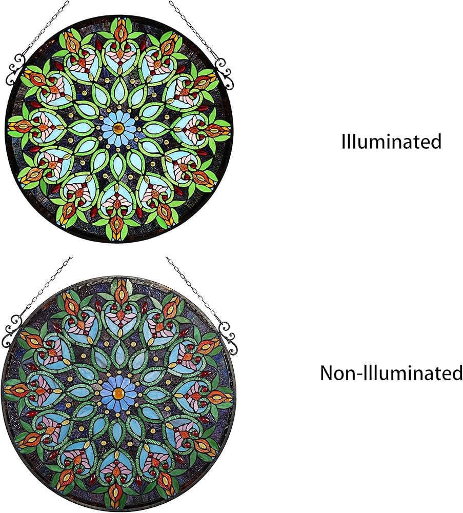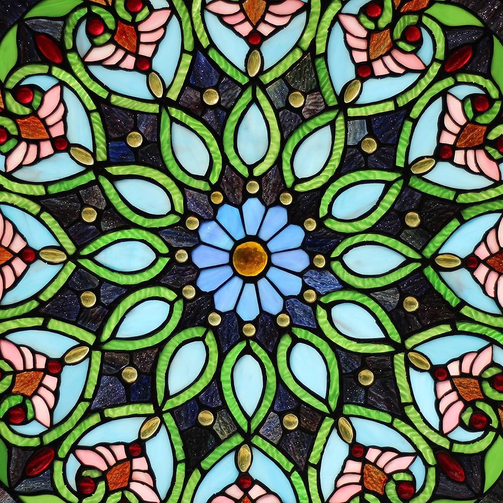 Arabella is a stunning Victorian Style tiffany-glass window panel, featuring gorgeous red, green, and navy blue colors. This Tiffany panel is made up of over 525 pieces of hand cut, stained art glass and 97 glass beads, expertly pieced and soldered together, to create each panel. Each of CHLOE's Tiffany-style stained glass panels are formed using the very same techninique developed by Louis Comfort Tiffany in the early 1900's, using hand cut stained art glass, each wrapped in fine copper foil and soldered together at extremely high temperatures to form each unique panels. Exact size to the nearest inch may vary, and exact color of each glass piece may vary due to each piece being hand crafted. First image is with the light shining through, second image is with no light.