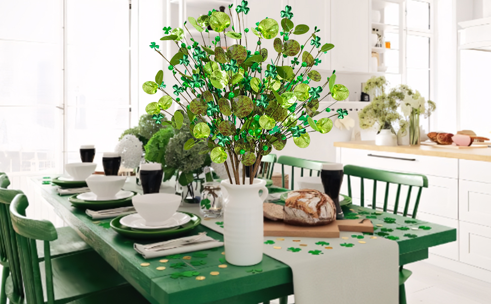 قطع زهور عيد القديس باتريك: مجموعة من 6 قطع، كل منها 60.96 سم. كل سيقان نبات النفل الاصطناعي مزينة بطبقات من أوراق الأوكالبتوس والتوت