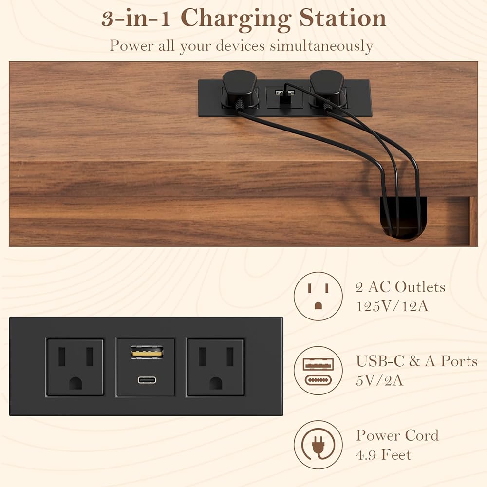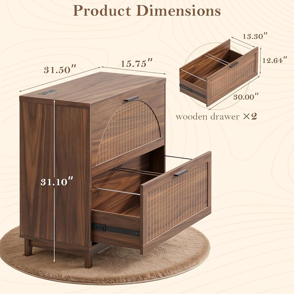 خزانة الملفات الجانبية ذات درجين مع محطة شحن للملفات المعلقة بحجم قانوني/حرف/A4، خزانات تخزين الملفات الكبيرة الحديثة المخددة، حامل الطابعة للمكتب المنزلي، خشب الجوز
