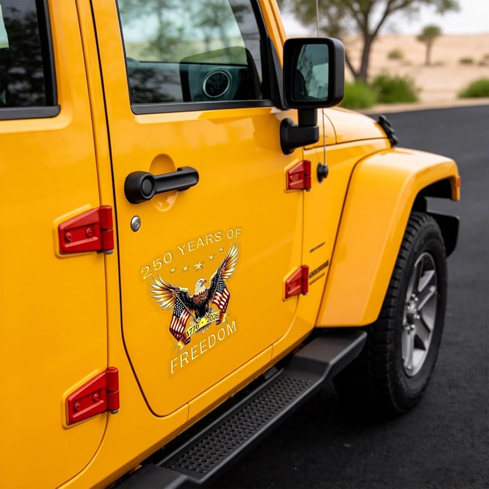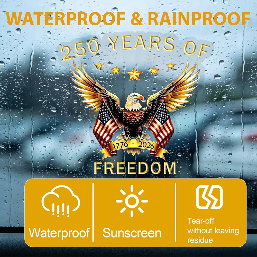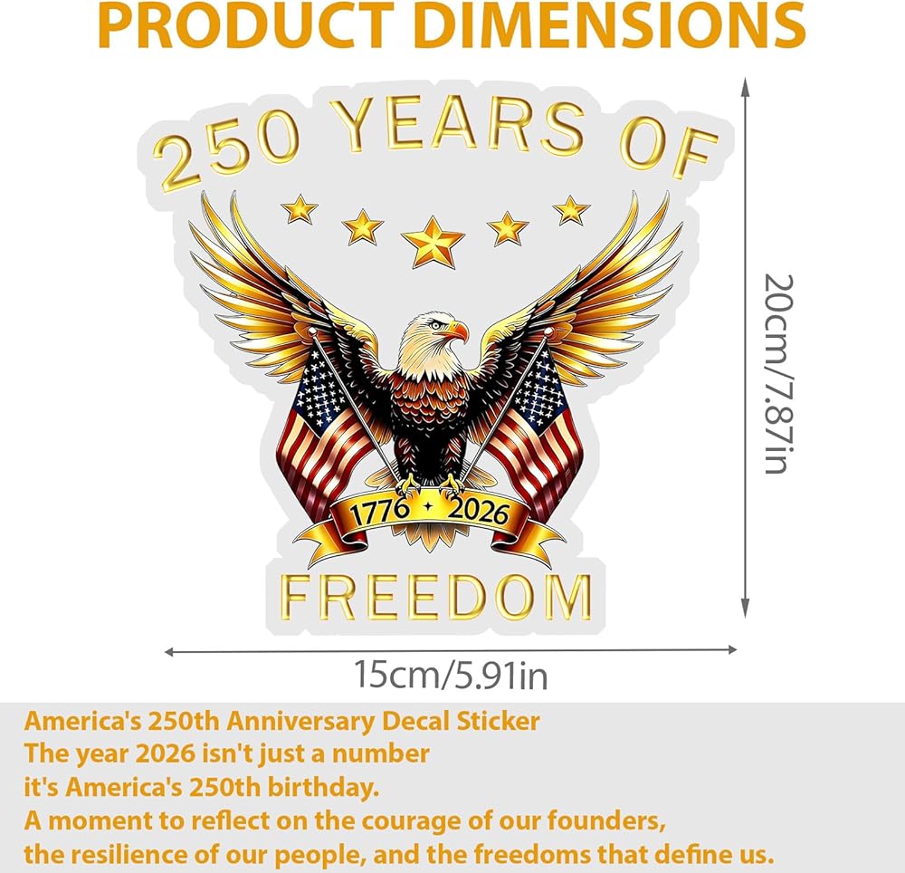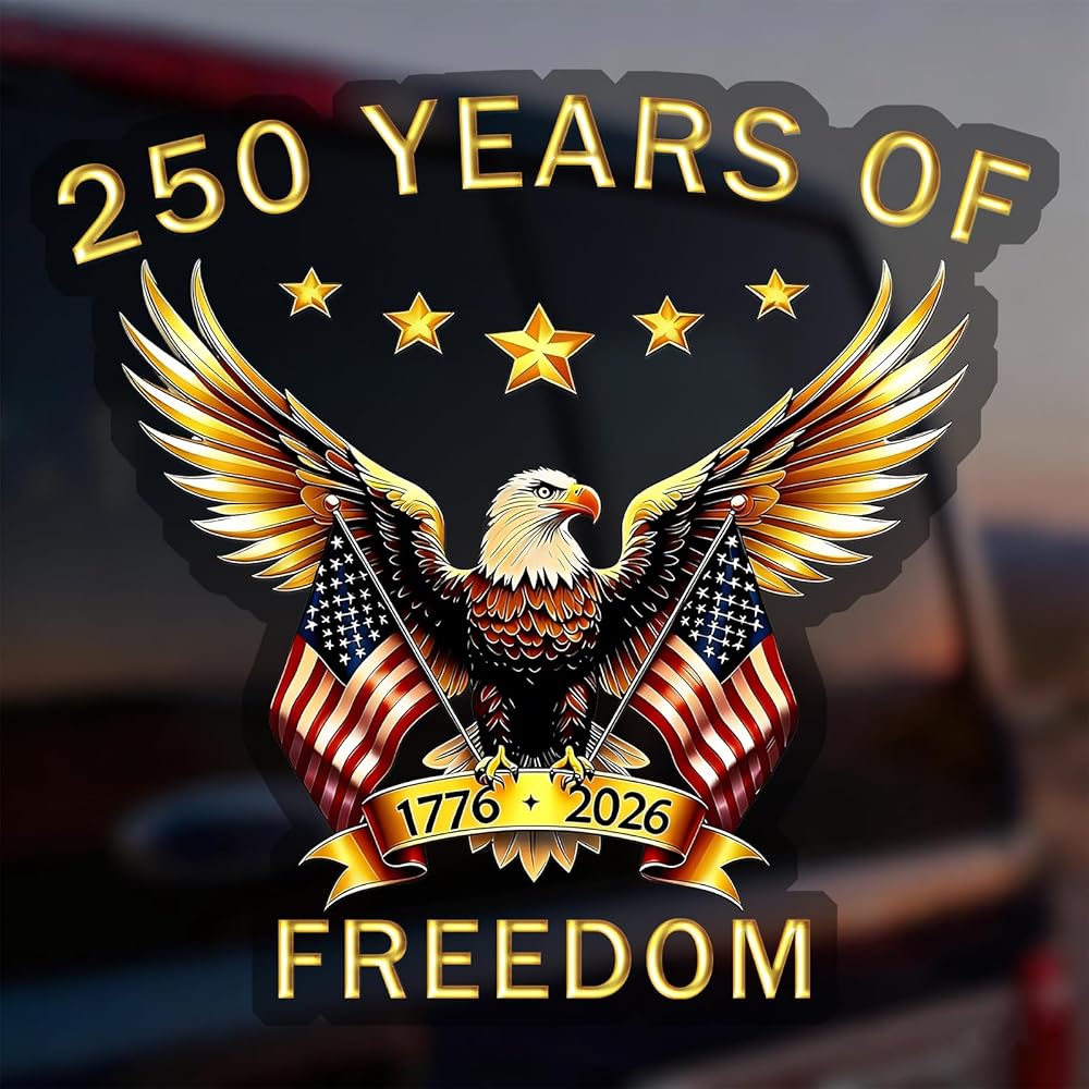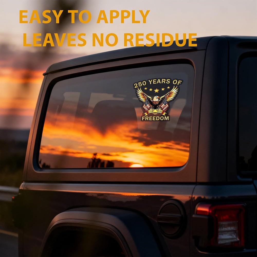 Mark the USA 250th anniversary milestone with this 2 pcs 250th anniversary USA stickers set. Each decal features a bold patriot eagle of Liberty style design inspired by the 1776 2026 celebration. These decals are made for anyone who wants easy patriotic merchandise that looks great on vehicles and everyday items. The stickers are made from waterproof UV resistant vinyl for daily use. They are designed to hold up through rain and sun and help keep the print looking clear. Use them as car window decals or place them on a bumper truck or SUV. They also work on smooth surfaces like laptops helmets water bottles tool boxes and storage cases.