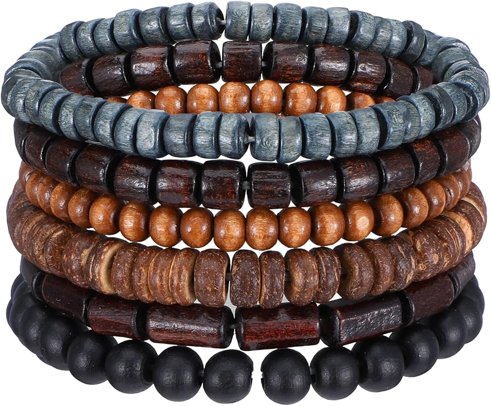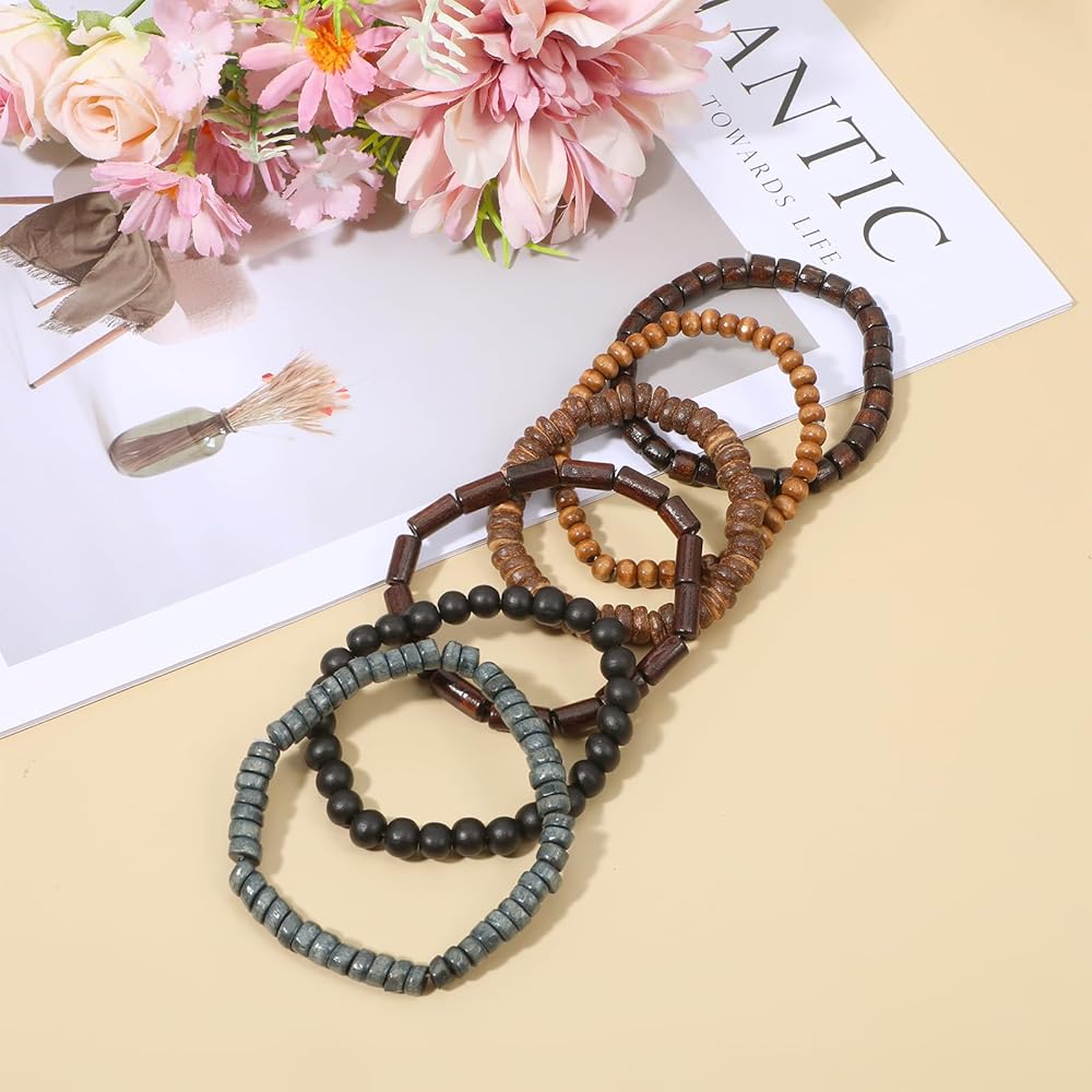 6 عبوات من الأساور الرجالية، أساور مطرزة للرجال، مجموعات أساور مطرزة خشبية عتيقة قابلة للتعديل كهدية لعيد الميلاد لصديق عيد الفصح، مجموعات الجرونج متعددة الطبقات للنساء