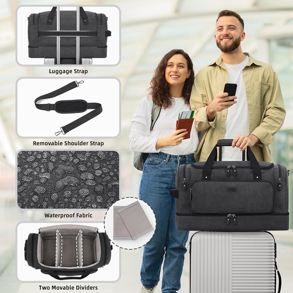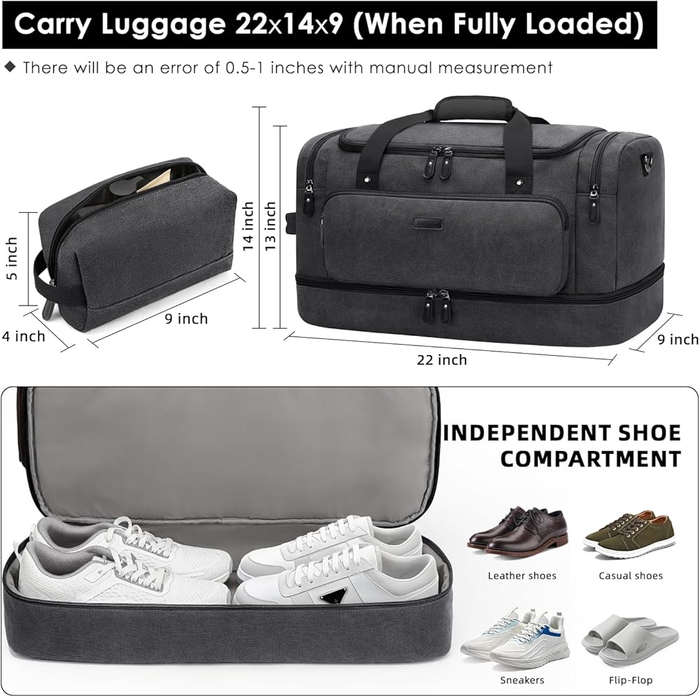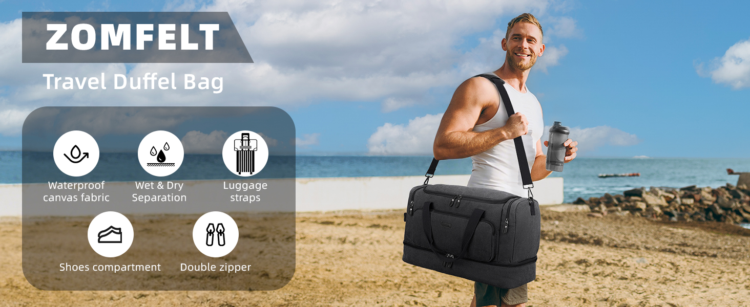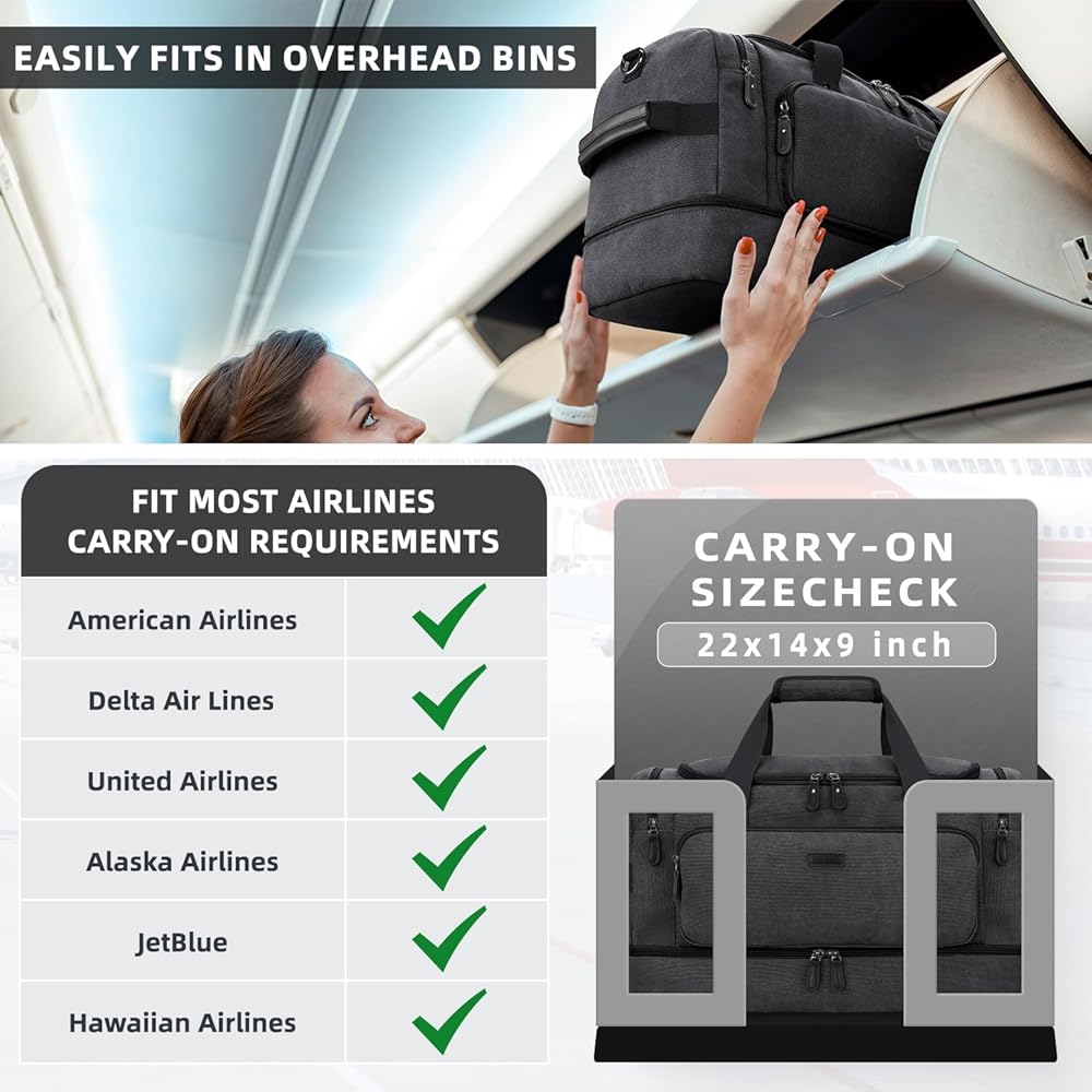 ZOMFELT حقيبة دفل للسفر، 40 لتر تحمل على الأمتعة 22 × 14 × 9 معتمدة من شركات الطيران، حقائب سفر من القماش الخشن للرجال والنساء، حقيبة مقاومة للماء طوال الليل مع جيب للأحذية للسفر، صالة الألعاب الرياضية، أسود