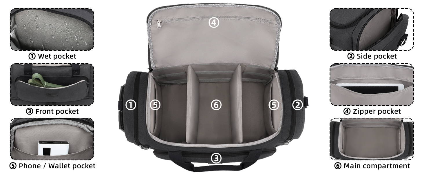 • سعة كبيرة وأقسام متعددة: جيبان منزلقان في الحجرة الرئيسية وجيب شبكي بسحاب في الجزء العلوي من حقيبة عطلة نهاية الأسبوع يسهّلان تنظيم كابلات الشحن وبنك الطاقة والمحفظة وما إلى ذلك. تأتي الحقيبة الليلية أيضًا مع فاصلين قابلين للإزالة يسمحان لك بتقسيم الحجرة الرئيسية إلى 2-3 مساحات أصغر حسب الحاجة لتنظيم متعلقاتك الشخصية بشكل أفضل.