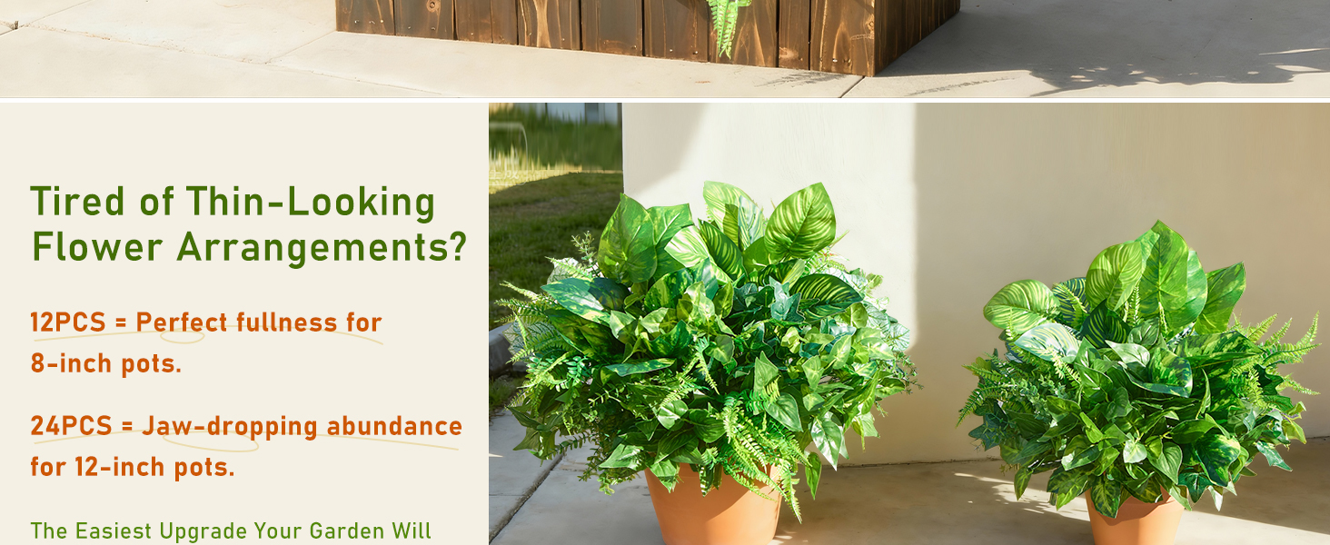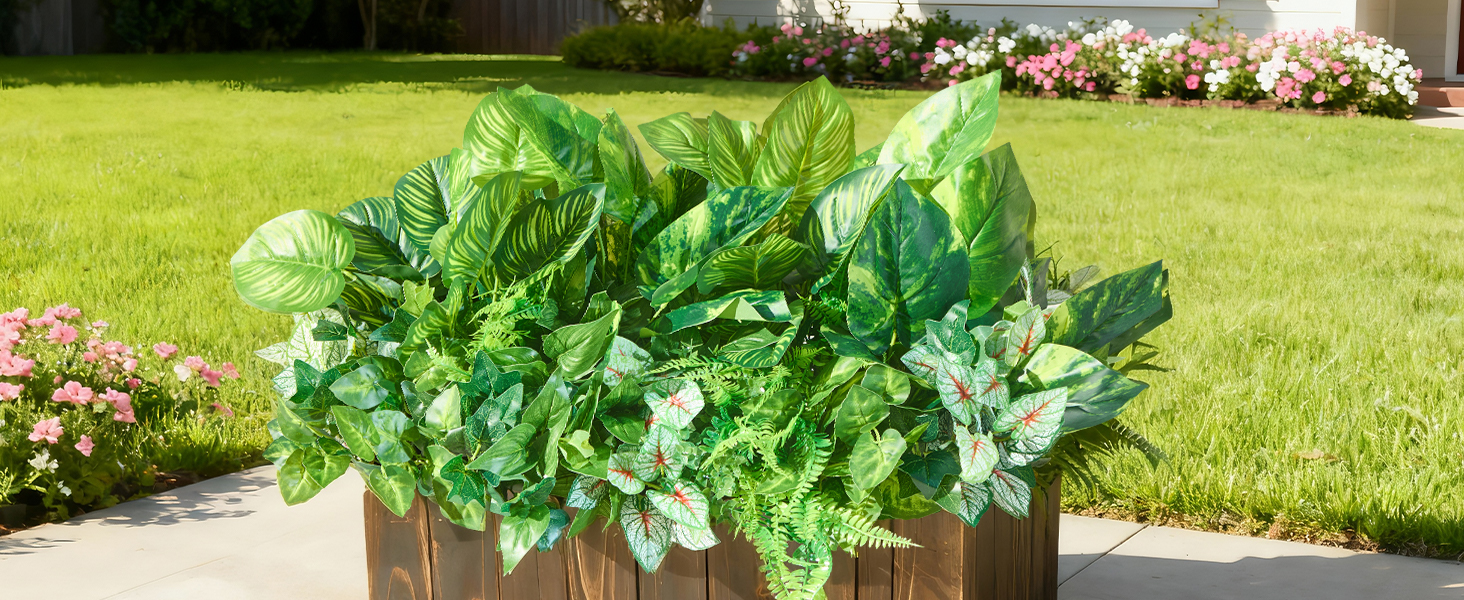 لا حاجة للصيانة: اختر نباتاتنا الخارجية الاصطناعية المقاومة للأشعة فوق البنفسجية، ولا تبهت أبدًا، وهي طويلة الأمد ومتينة. لا داعي للقلق بشأن مشكلات مثل ضوء الشمس أو الري أو التقليم، استمتع بالخضرة المورقة طوال العام.