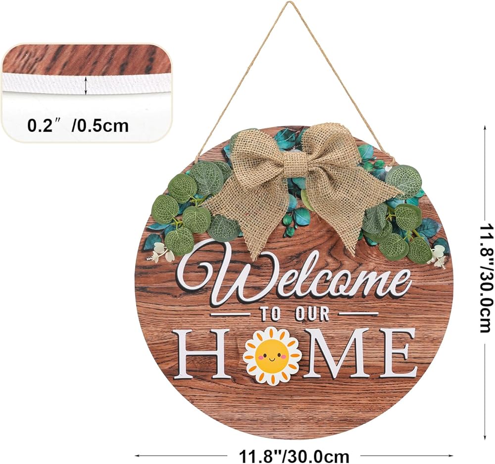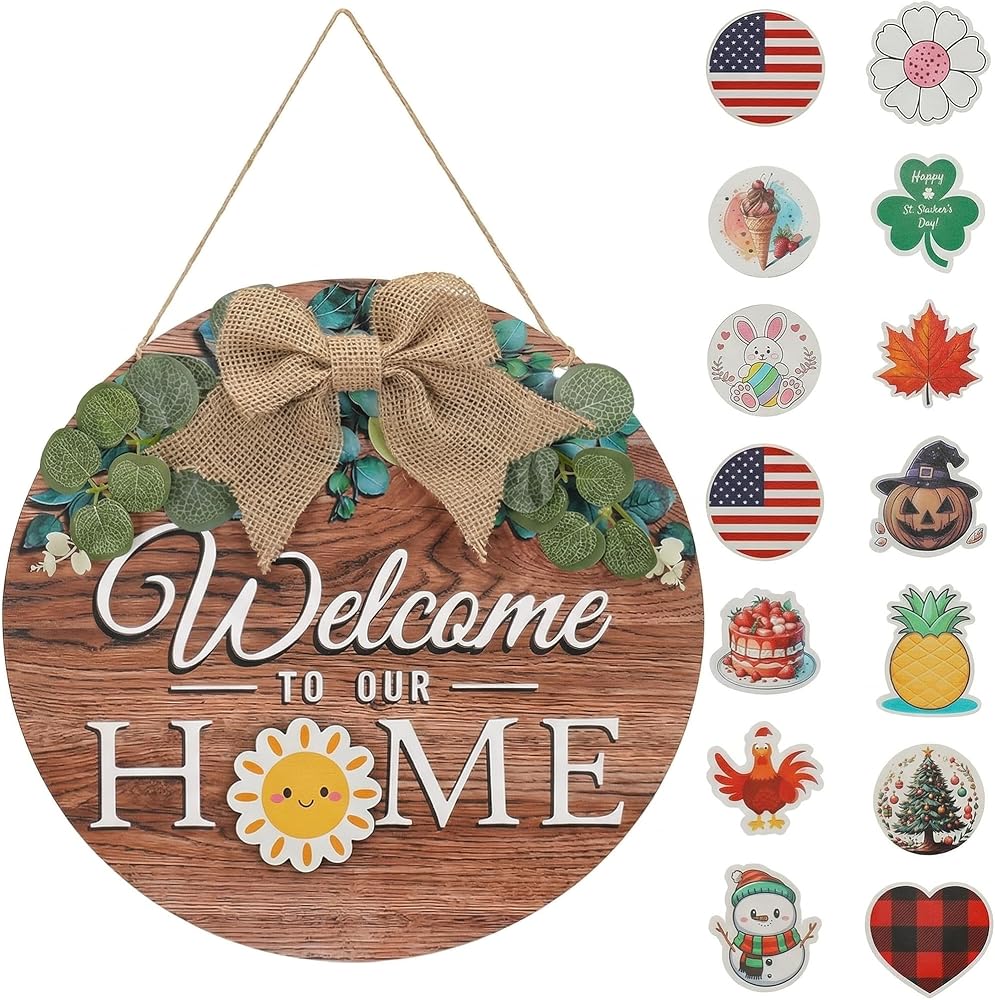 Interchangeable Seasonal Welcome Door Sign Front Door, Rustic Round Wreaths Wall Hanging outdoor Porch Decor for Housewarming Gifts, Welcome to Our Home Sign for Seasons Holiday