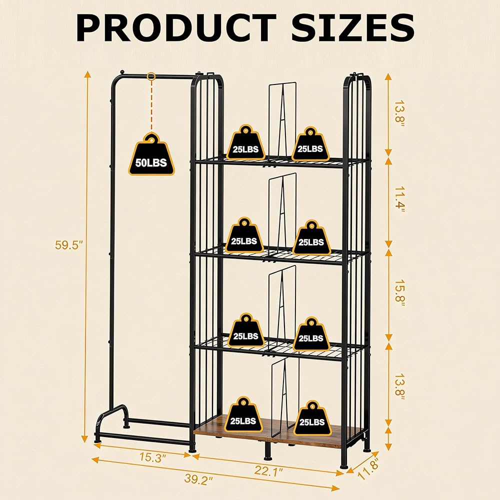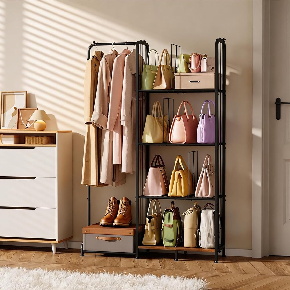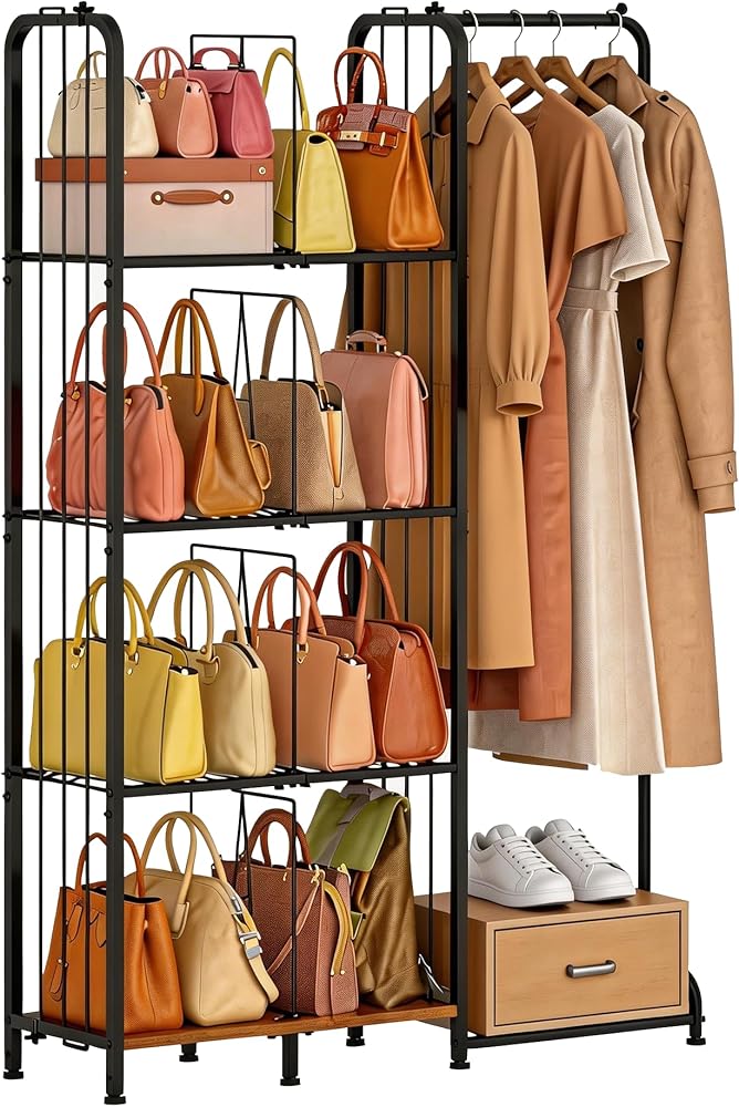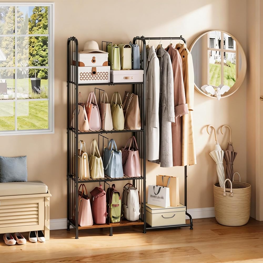 【حامل حامل محفظة من 4 طبقات】: يتيح لك منظم خزانة المحفظة هذا الوصول بسهولة إلى حقائبك وتنسيق ملابسك اليومية بسرعة. بفضل تصميمه البسيط، فإنه يضيف لمسة أنيقة إلى أي مساحة وهو مثالي لزوايا غرفة النوم، وخزائن الملابس، وغرف المعيشة، وخزائن الملابس، ورفوف المعاطف، ومناطق الزينة. لا مزيد من الفوضى الفوضوية قبل الخروج. الحجم: 39.2 بوصة طول × 11.4 بوصة عرض × 59.5 بوصة ارتفاع