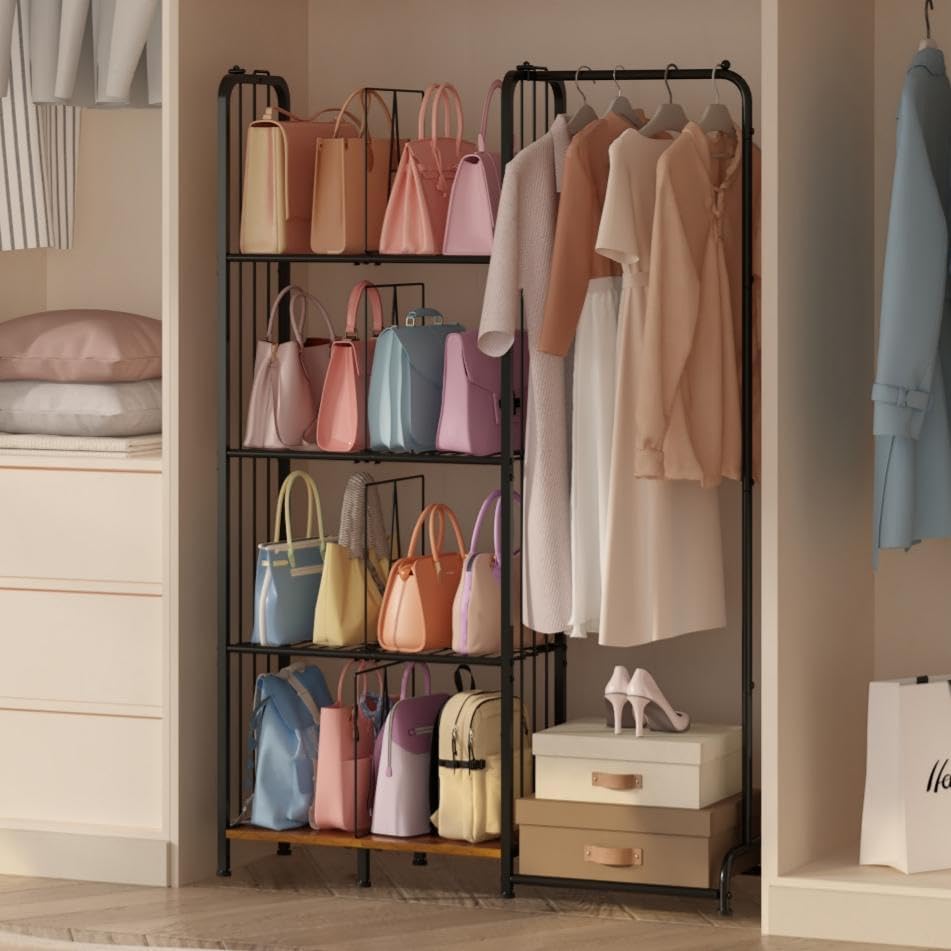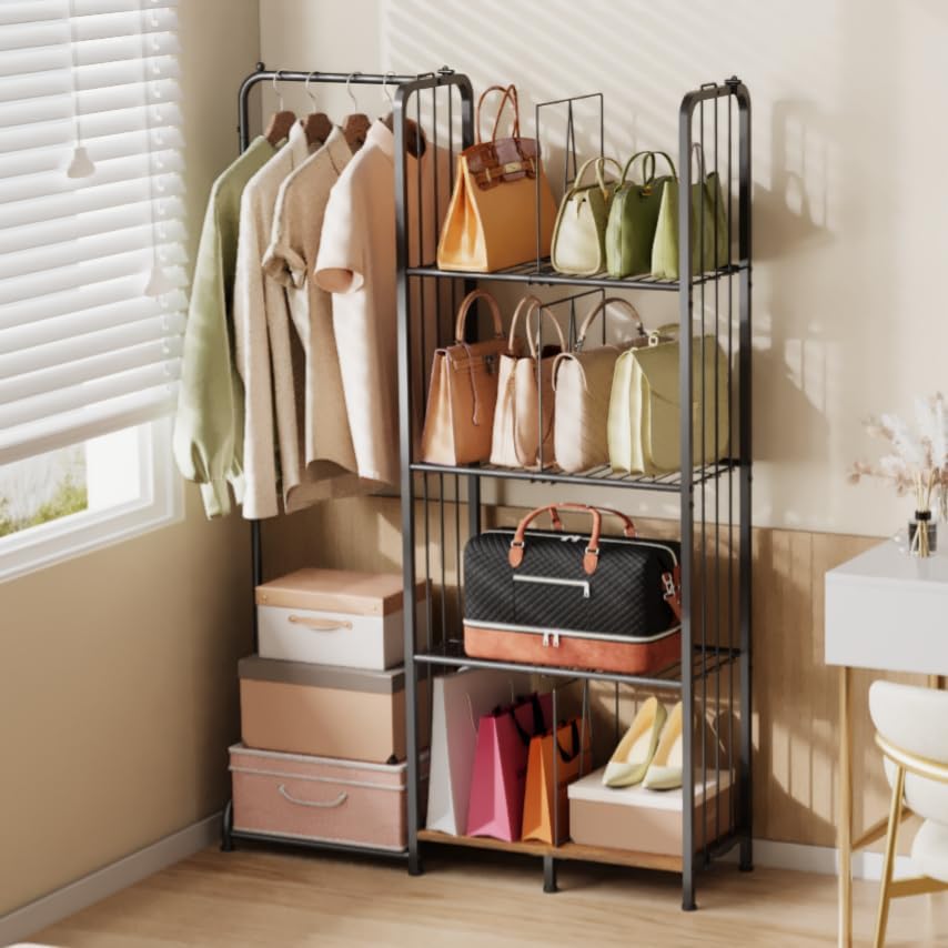 منظم محفظة ذو 4 طبقات قائم على الأرض للخزانة مع أقدام وفواصل قابلة للتعديل، تخزين محفظة عالي السعة مع منطقة تعليق الملابس، حامل حامل معدني وخشبي لتنظيم حقائب اليد