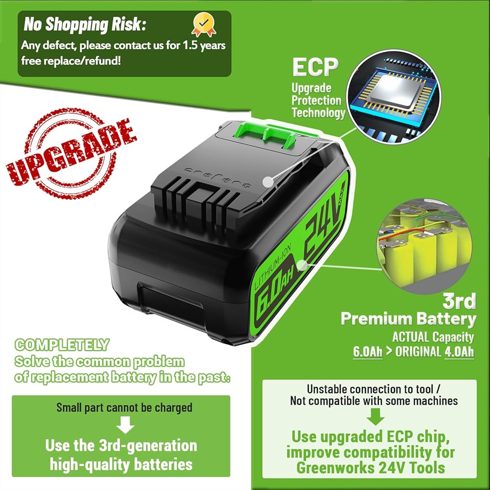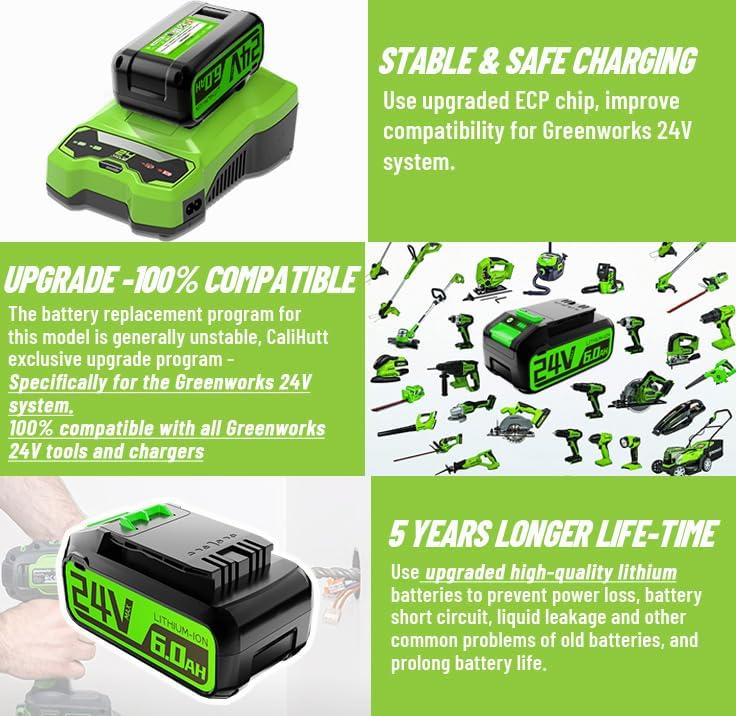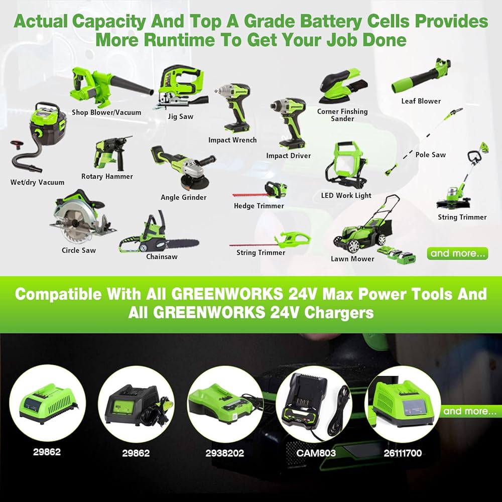 ✔【متوافقة على نطاق واسع وملاءمة سلسة】مناسبة بنسبة 100% ومتوافقة مع جميع أدوات Greenworks 24V اللاسلكية وجميع شواحن Greenworks 24V (GCH8040...).