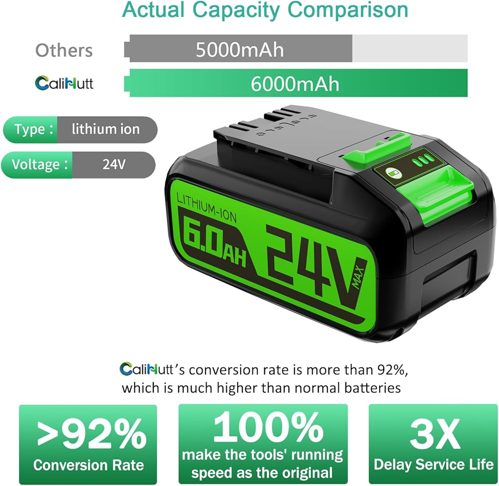 ✔【سعة عالية وشحن سريع】24 فولت 6000 مللي أمبير في الساعة لسلسلة Greenworks 24V. توفر السعة الفعلية والدرجة الأولى لبطارية الليثيوم أيون وقت تشغيل أطول مقارنة بالبطارية الأصلية، ووقت خدمة 2X وسرعة شحن سريعة تصل إلى 60 دقيقة.