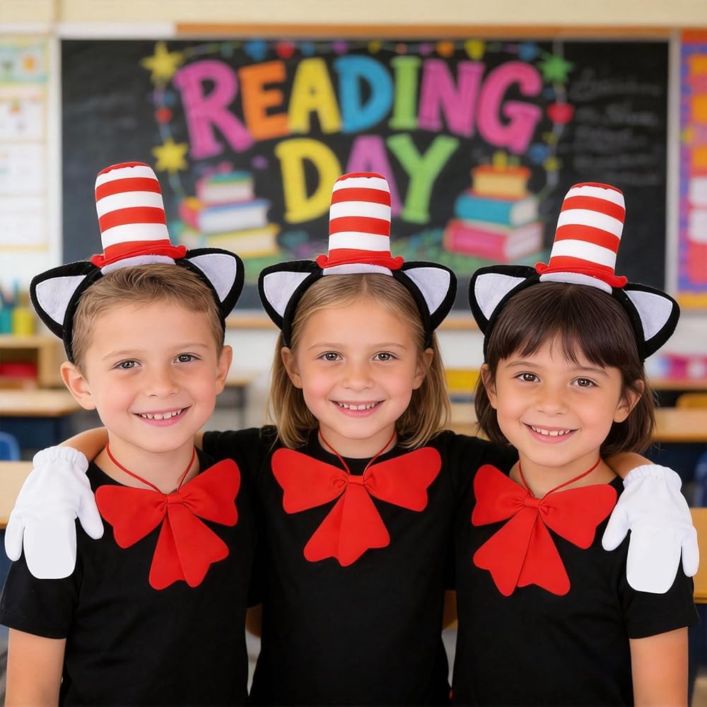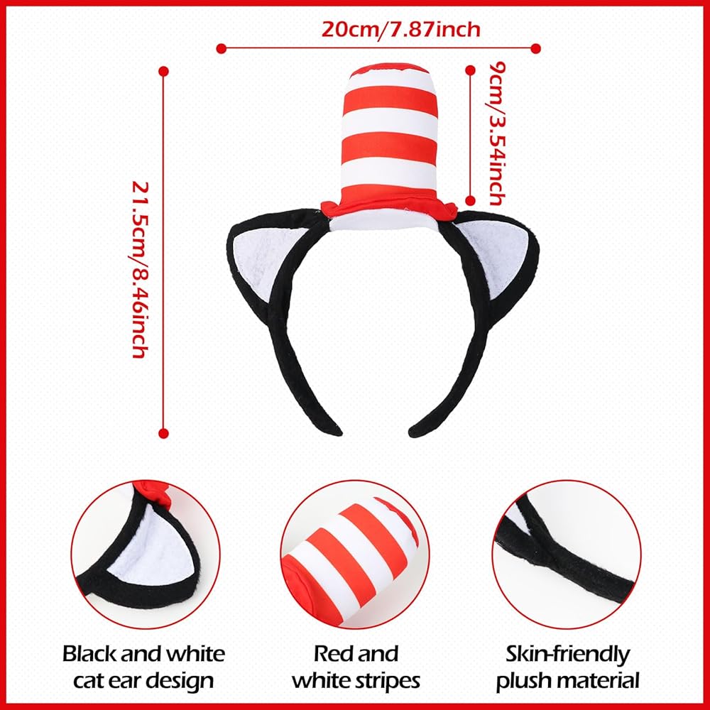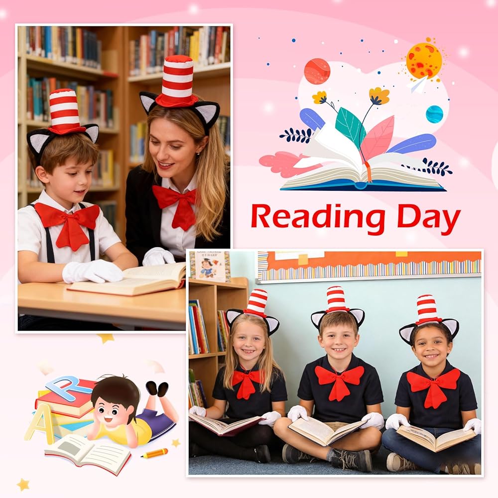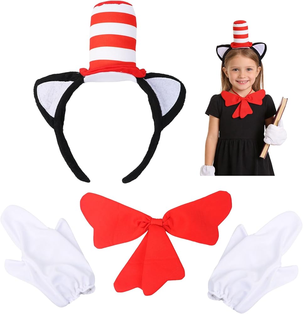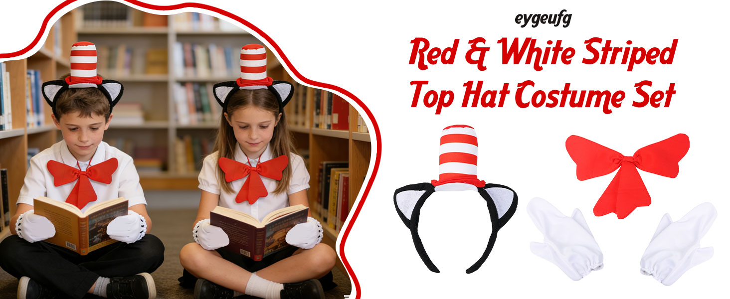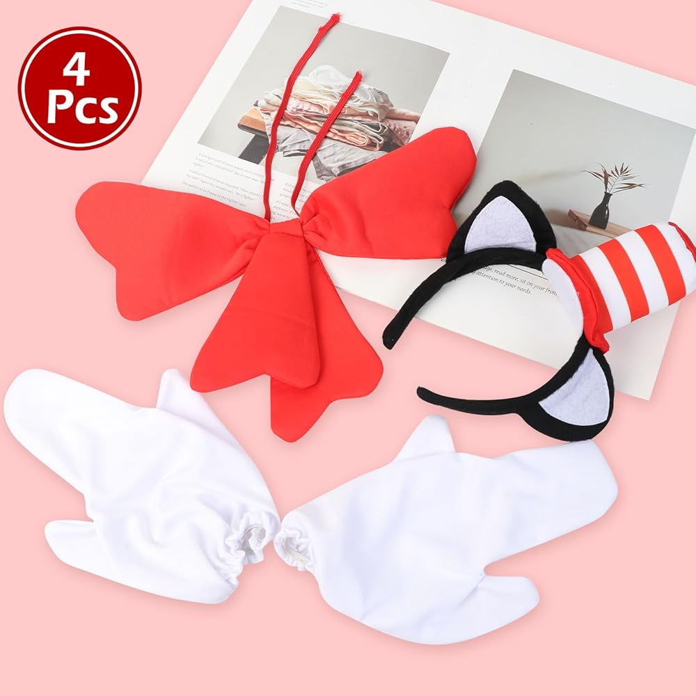 مجموعة أزياء eygeufg ذات القبعة العلوية المخططة - عصابة رأس وربطة عنق كبيرة وقفازات للمراهقين (14+) والكبار تحت عنوان الأحداث والعروض المسرحية (3 قطع باللونين الأحمر والأبيض)