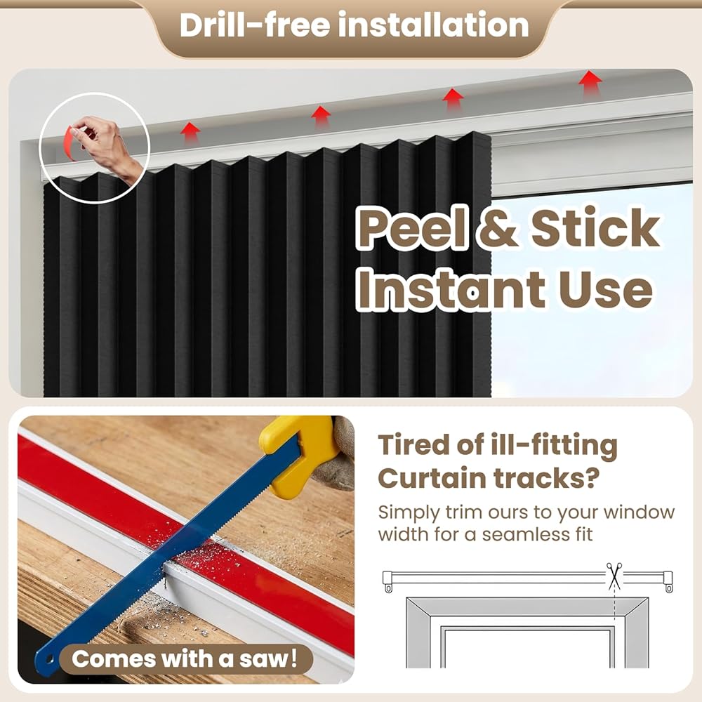 • ستائر نوافذ لاسلكية للمنزل - مسار قماشي من قطعة واحدة يتم تركيبه في دقائق؛ لا توجد أسلاك صغيرة عمياء، ولا مسامير، مثالية للأطفال والحيوانات الأليفة.