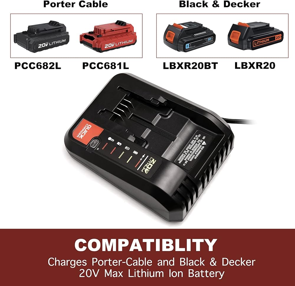 • توافق واسع: شاحن بطارية بورتر 20 فولت متوافق مع بطارية ليثيوم 20 فولت PCC680L، PCC681L، PCC682L، PCC685L، PCC699L. ومتوافقة مع بطارية ليثيوم بلاك ديكر 20 فولت LBXR20، LBX20، LBX4020، LBXR2020-OPE.