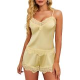 • 【المميزات: قميص داخلي حريري: زخرفة من الدانتيل وأشرطة كتف قابلة للتعديل، رقبة على شكل حرف V. الجزء السفلي: شورت قصير بحاشية مكشكشة، وبنطلون مطاطي عالي التمدد. بسيط وأنيق، يُظهر منحنيات جسمك بطريقة تغطية لطيفة