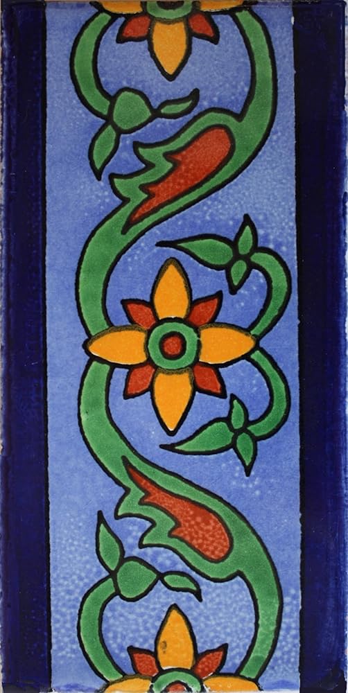 This Talavera clay tile is hand-painted in floral motifs with a cobalt blue frame on top and bottom. This subway tile can be used as an accent piece or in a wall as a liner as shown in the second picture.DISCLAIMER:All of our Talavera tiles have a heavily hand-made process involved; as such, imperfections are expected. Color variations are to be expected from batch to batch. What you see on your screen might not be exactly what you will get, this is mostly due to several factors, among others: lighting when the picture was taken, lighting in your own monitor, but mostly changes in the glazes used between batches. All these factors are beyond our control. If in doubt, we recommend you to order a sample before committing to a bigger order.