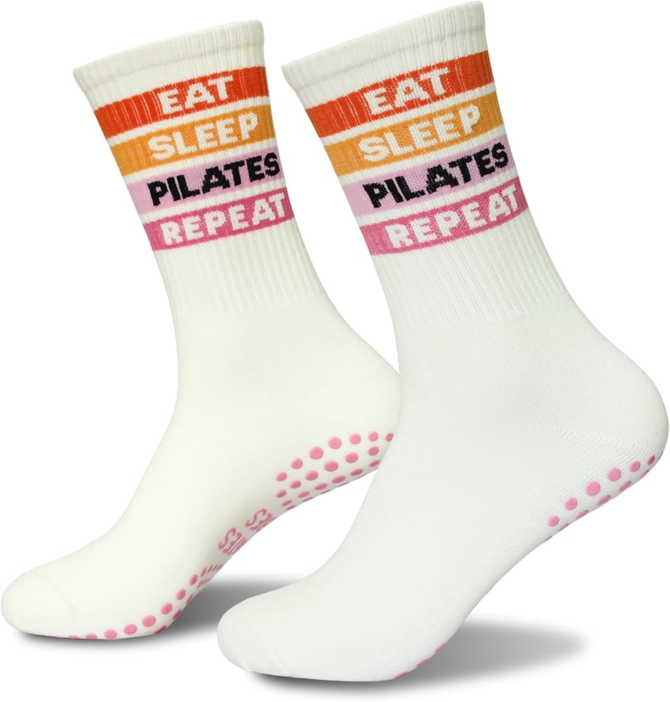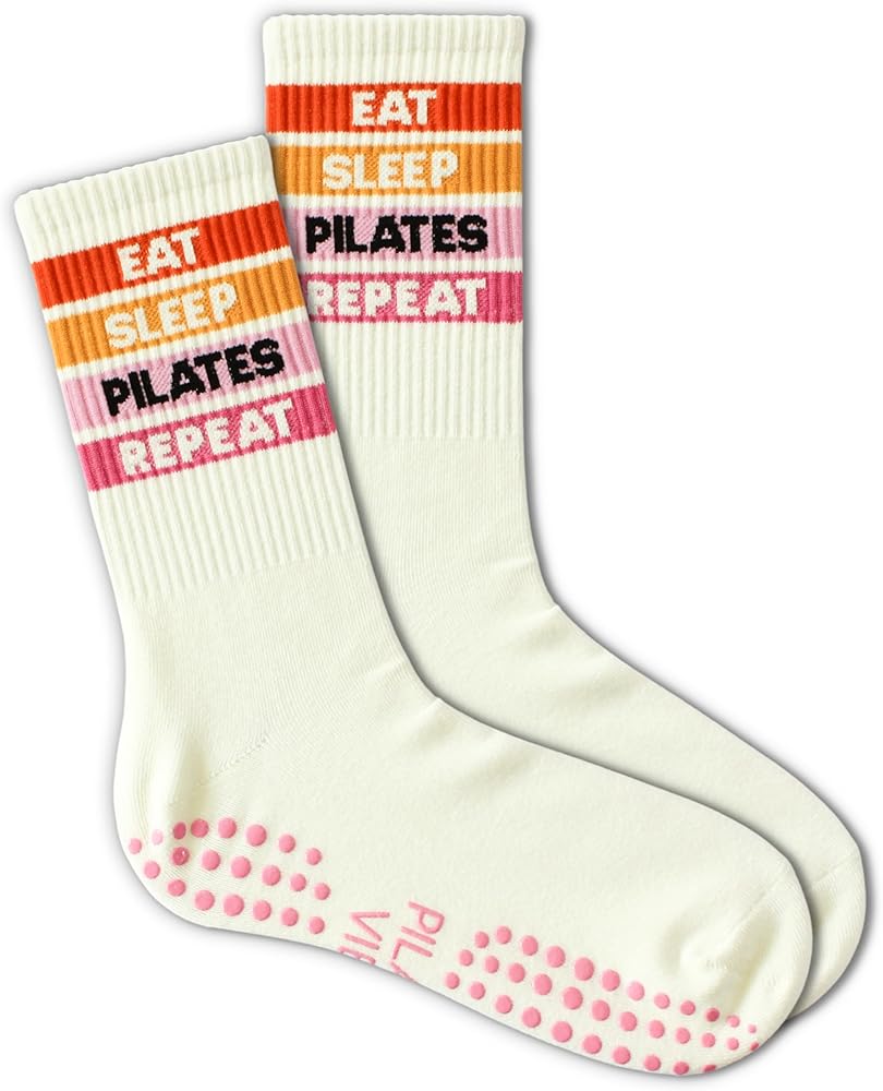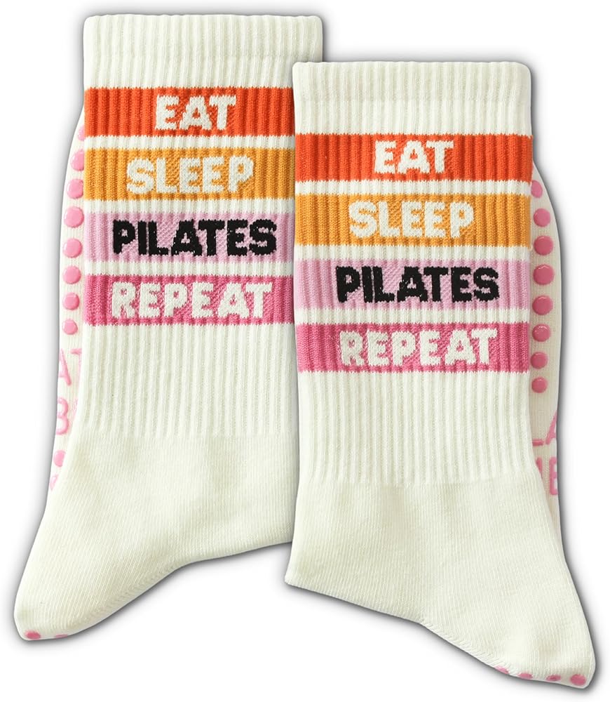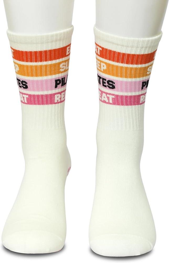 Bold and colorful, these beige crew socks say it all—“EAT SLEEP PILATES REPEAT” across bright stripes that inspire consistency and movement. Designed for comfort and traction, these grip socks pilates women are a daily motivator for pilates lovers.