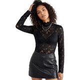 تصميم أنيق بتفاصيل أنثوية: يتميز برقبة وهمية متطورة وأنماط دانتيل زهرية رقيقة توفر لمحة رقيقة عن الجلد. التفاصيل المنسوجة وأساور الأكمام المزخرفة بالدانتيل تخلق صورة ظلية أنيقة ورومانسية، بينما يبرز مقاس الجسم شكلك بشكل جميل