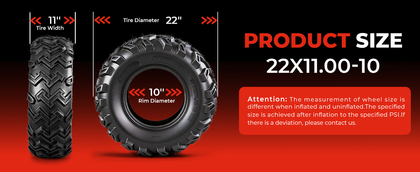 • توافق واسع للمركبة: يناسب مواصفات الحجم 22x11-10 (22x11x10) وإطارات 10 بوصة؛ مناسبة لمعظم موديلات ATV وUTV، بالإضافة إلى جزازات العشب والمركبات المساعدة. غير مخصصة للاستخدام على الطرق السريعة.