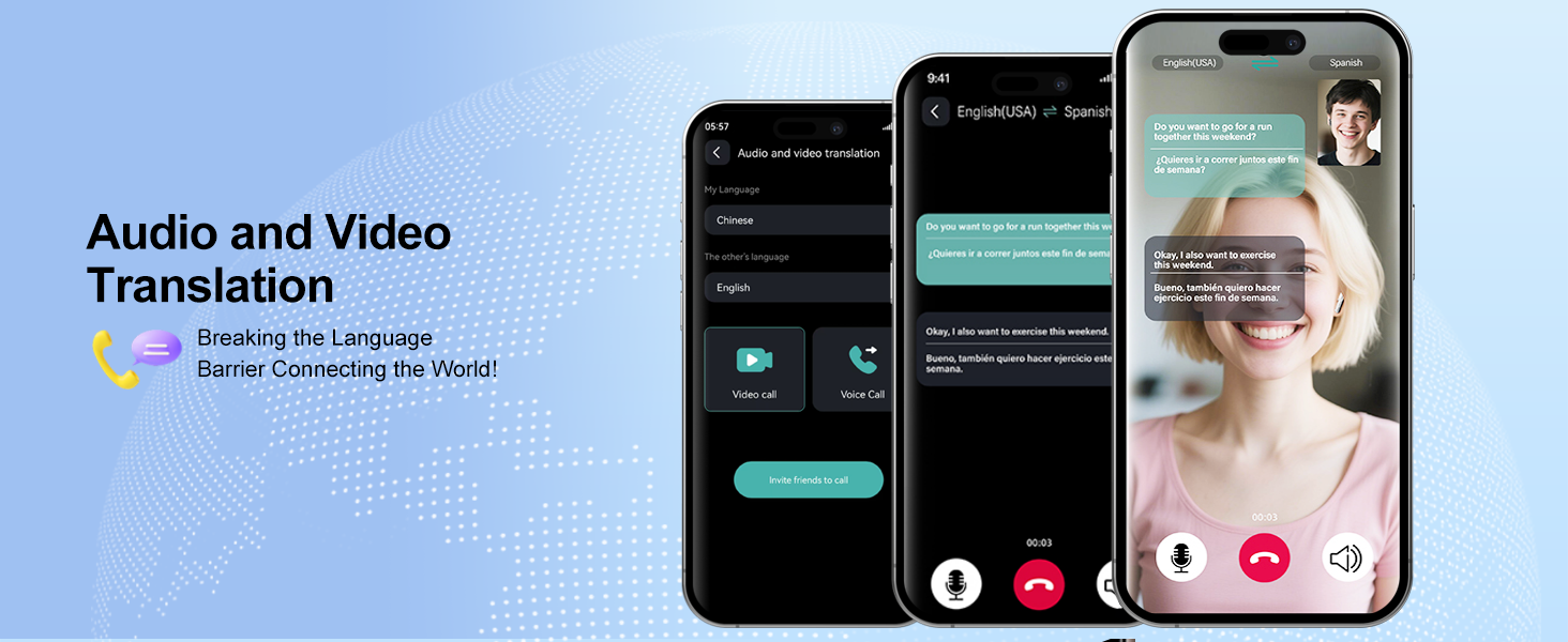 ترجمة مكالمات الصوت والفيديو: سماعات أذن المترجم الخاصة بنا مزودة بترجمة متقدمة لمكالمات الصوت والفيديو في الوقت الفعلي، كما أن سماعات أذن المترجم الخاصة بنا تجعل الاتصال العالمي سهلاً. قم بتحويل المحادثات على الفور أثناء المؤتمرات الدولية، أو العمل الجماعي عن بعد، أو المفاوضات التجارية، أو محادثات الفيديو مع الأصدقاء في الخارج، حيث تعمل سماعات الأذن هذه على إزالة حواجز اللغة على الفور. استمتع بمحادثات سلسة وفعالة لتعزيز إنتاجية العمل والتواصل الاجتماعي.