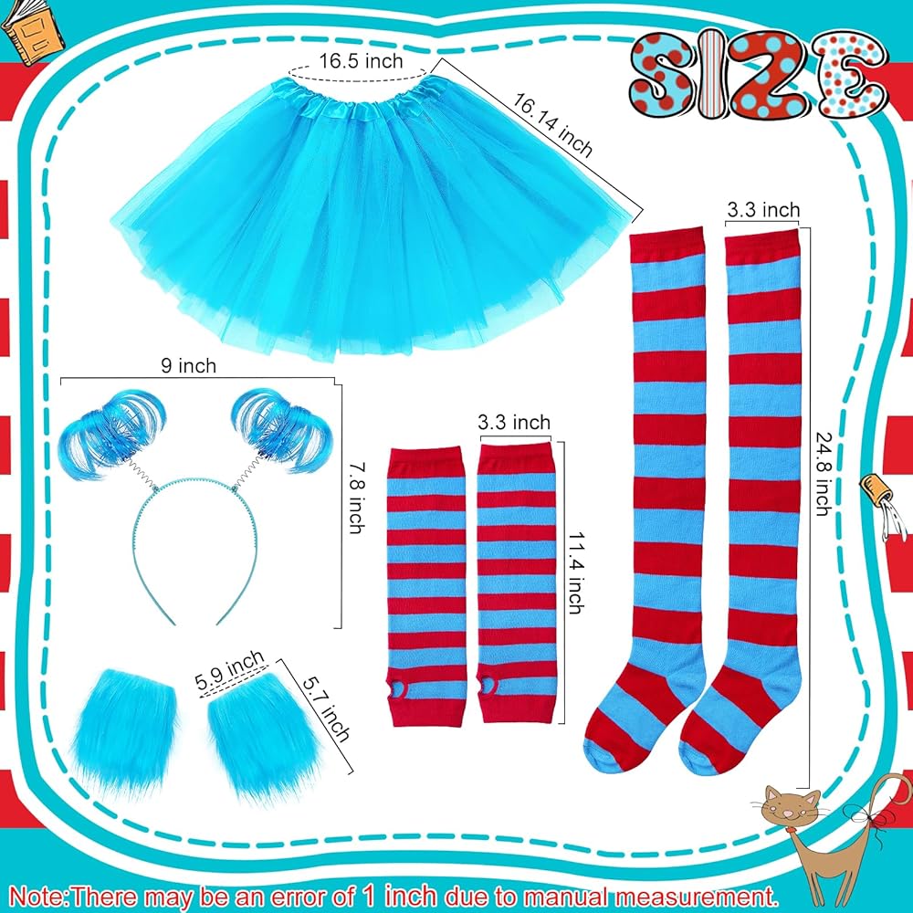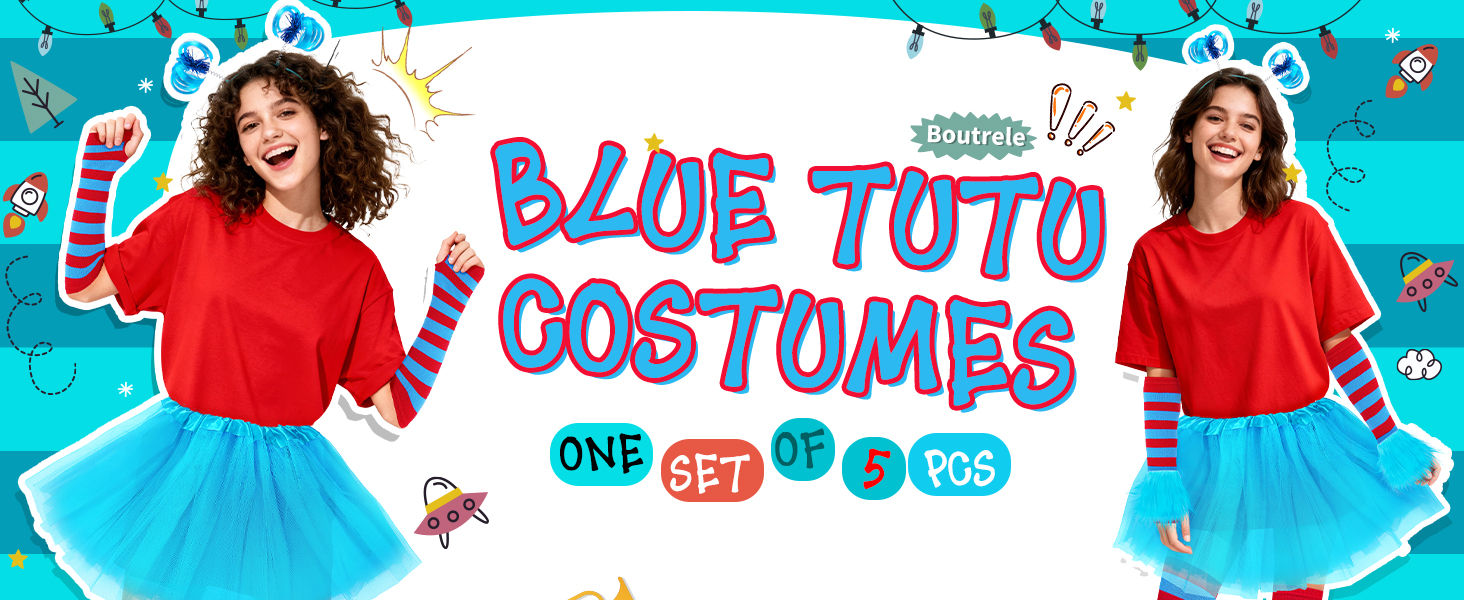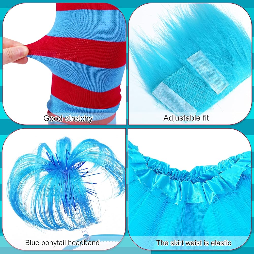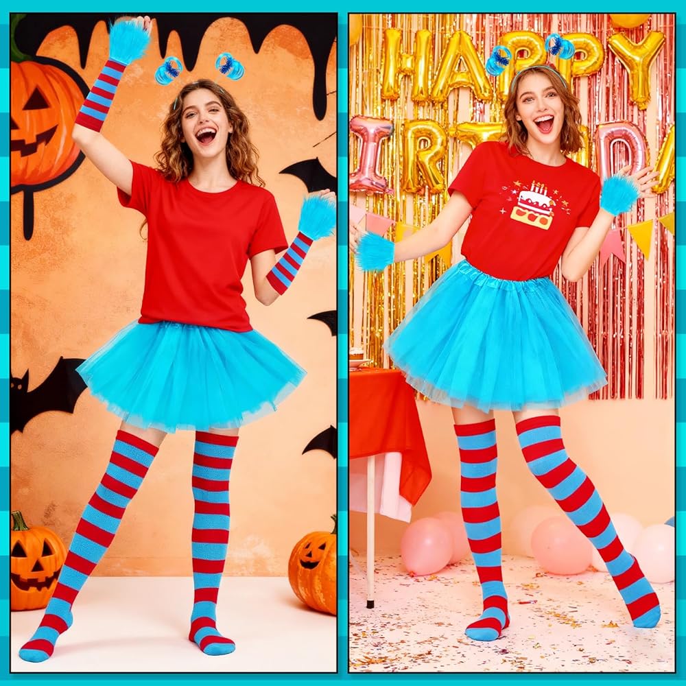 مجموعة أزياء الهالوين النسائية: تتضمن تنورة توتو من التول الأزرق، 1 عصابة رأس على شكل ذيل حصان، 1 زوج من أساور المعصم الفاخرة، 1 زوج من الجوارب الطويلة حتى الركبة مخططة باللون الأحمر والأزرق، 1 زوج من القفازات المتطابقة. مجموعة كاملة مكونة من 5 قطع تجعل من السهل إنشاء أزياء شخصية كتاب ممتعة للبالغين