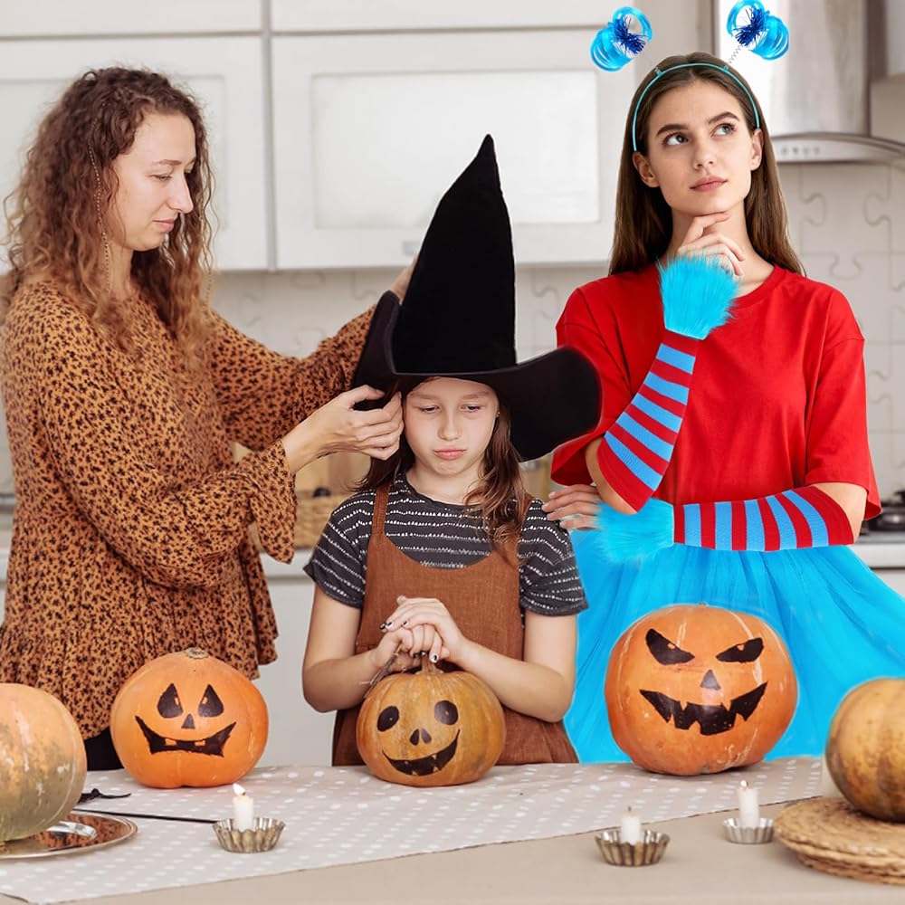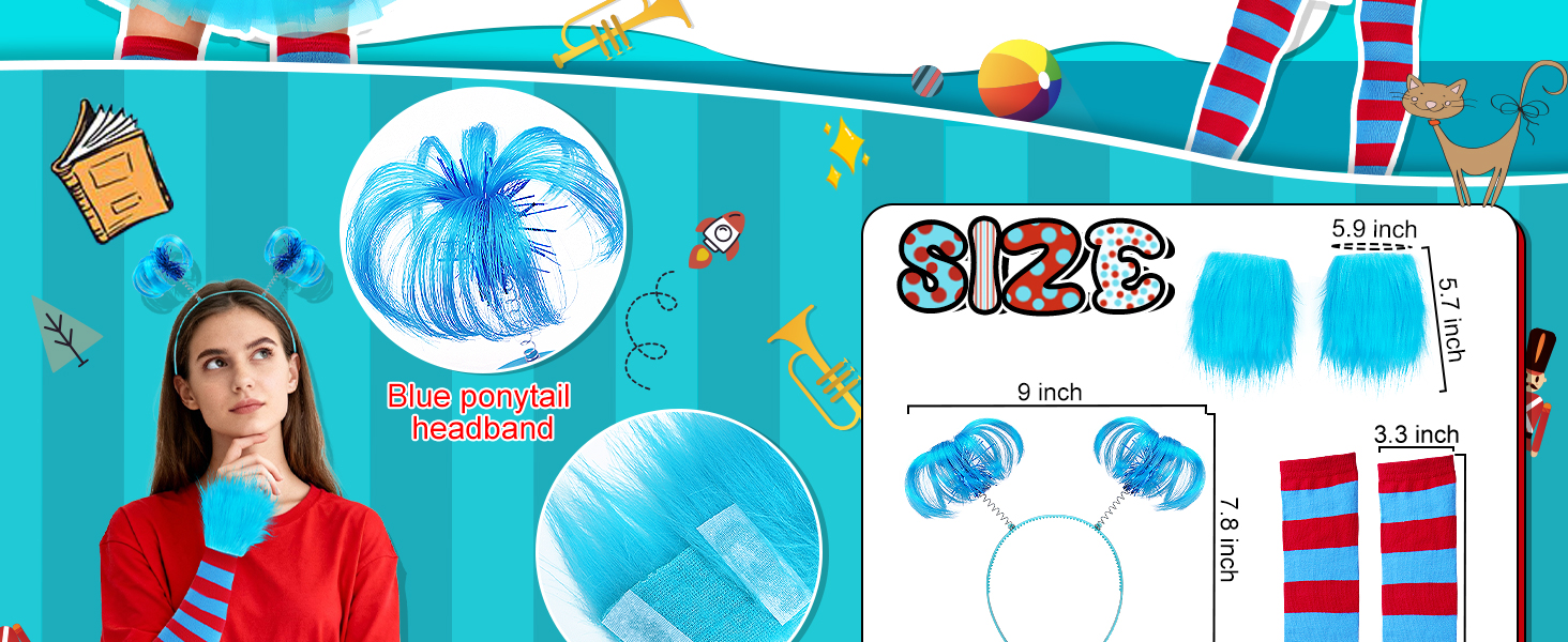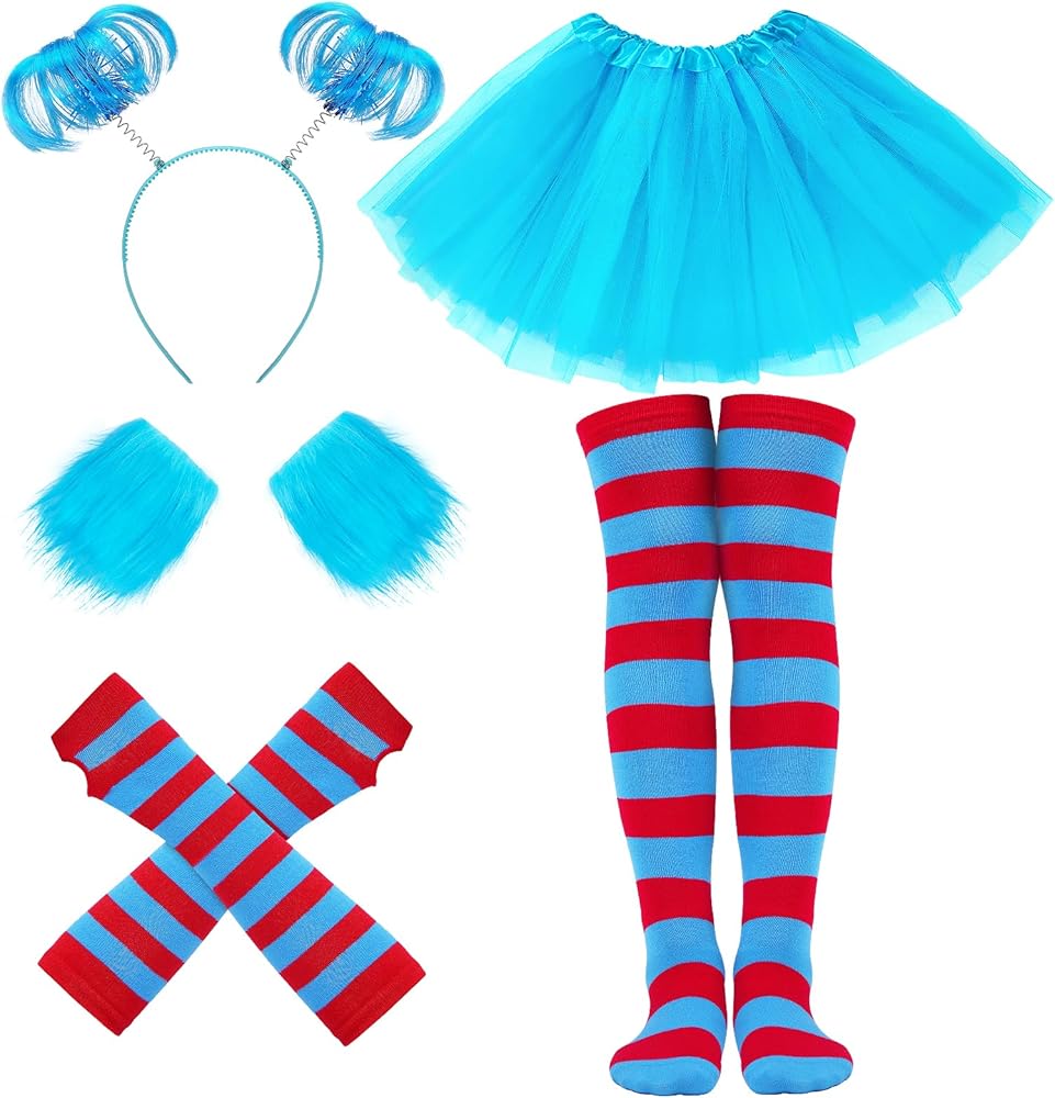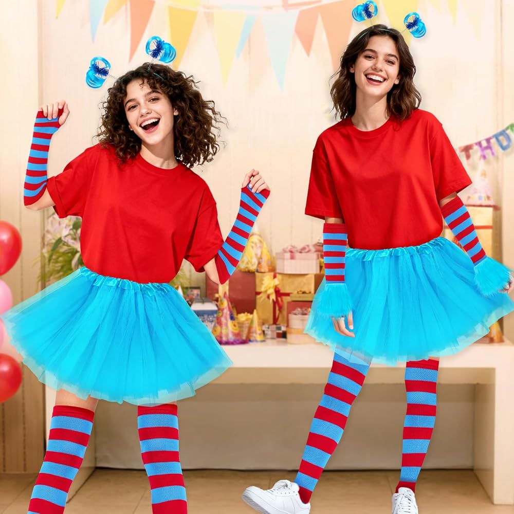 مجموعة أزياء الهالوين النسائية: تتضمن تنورة توتو من التول الأزرق، 1 عصابة رأس على شكل ذيل حصان، 1 زوج من أساور المعصم الفاخرة، 1 زوج من الجوارب الطويلة حتى الركبة مخططة باللون الأحمر والأزرق، 1 زوج من القفازات المتطابقة. مجموعة كاملة مكونة من 5 قطع تجعل من السهل إنشاء أزياء شخصية كتاب ممتعة للبالغين