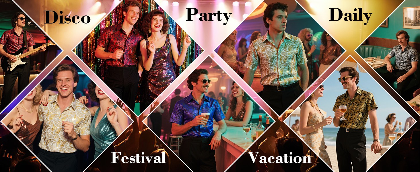 المناسبة: مناسبة لحفلات السبعينيات، وحفلات الثمانينيات، وحفلات الديسكو، والارتداء اليومي، والنوادي الليلية، والإجازات، والسفر، والحفلات، والمهرجانات، وحفلات الزفاف، والتواريخ، وأعياد الميلاد، والرقصات، والهالوين، وما إلى ذلك. يمكنك إقران القميص مع قيعان الجرس، والأحذية الجلدية، وما إلى ذلك لإنشاء نمط كلاسيكي قديم من السبعينيات